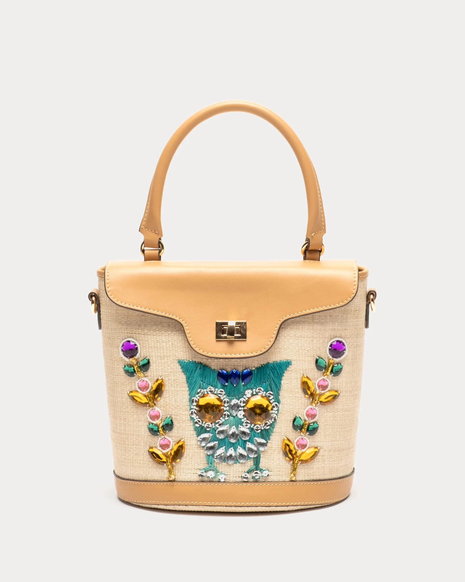 We designed our Agatha Basket as a canvas for glamorous embroidery, creating an everyday handbag as fashionable as it is functional. With a colorful bird motif and bold gem decals embellishing the structured fabric frame–Agatha has smooth leather edges and a fold-over top with metal clasps for safe keeping of your essentials. Adjust the straps for versatile wear on this eye-catching centerpiece.