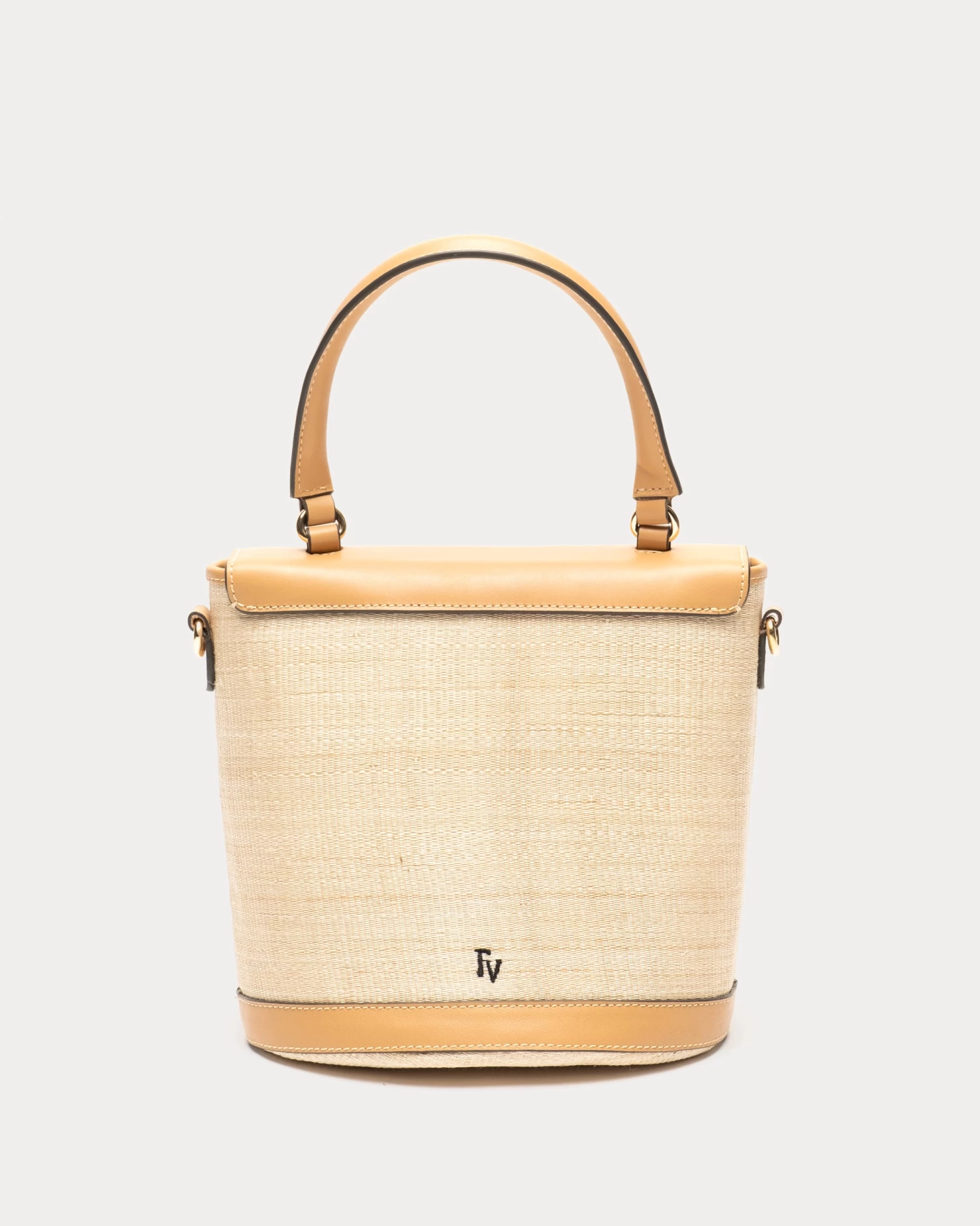 Embroidered canvas basket with leather detailing. Metal clasp closure. Interior zip pocket. Cotton twill lining. Detachable and adjustable crossbody strap.