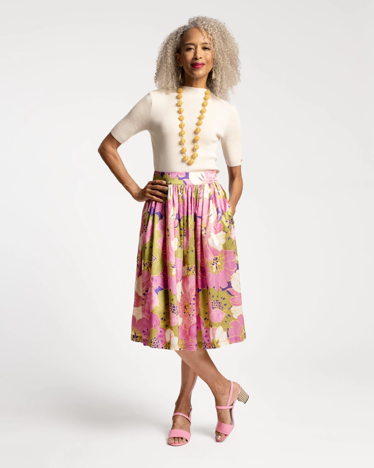 Add a little fun to your look with our Barbara Midi skirt. A voluminous women’s skirt design with pleated fabric details and a fitted, elastic waistband – this piece easily elevates any tank top or long sleeve into something a bit more elegant.
