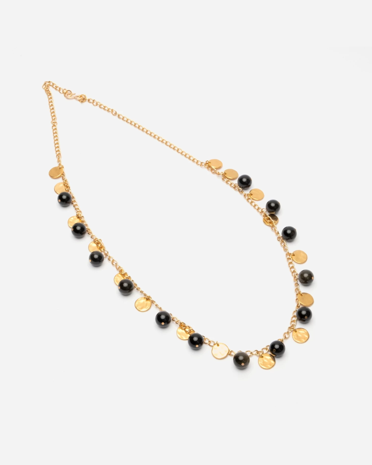 Textural discs in plated precious metals are arranged with black beads add shine and color to this statement making necklace.