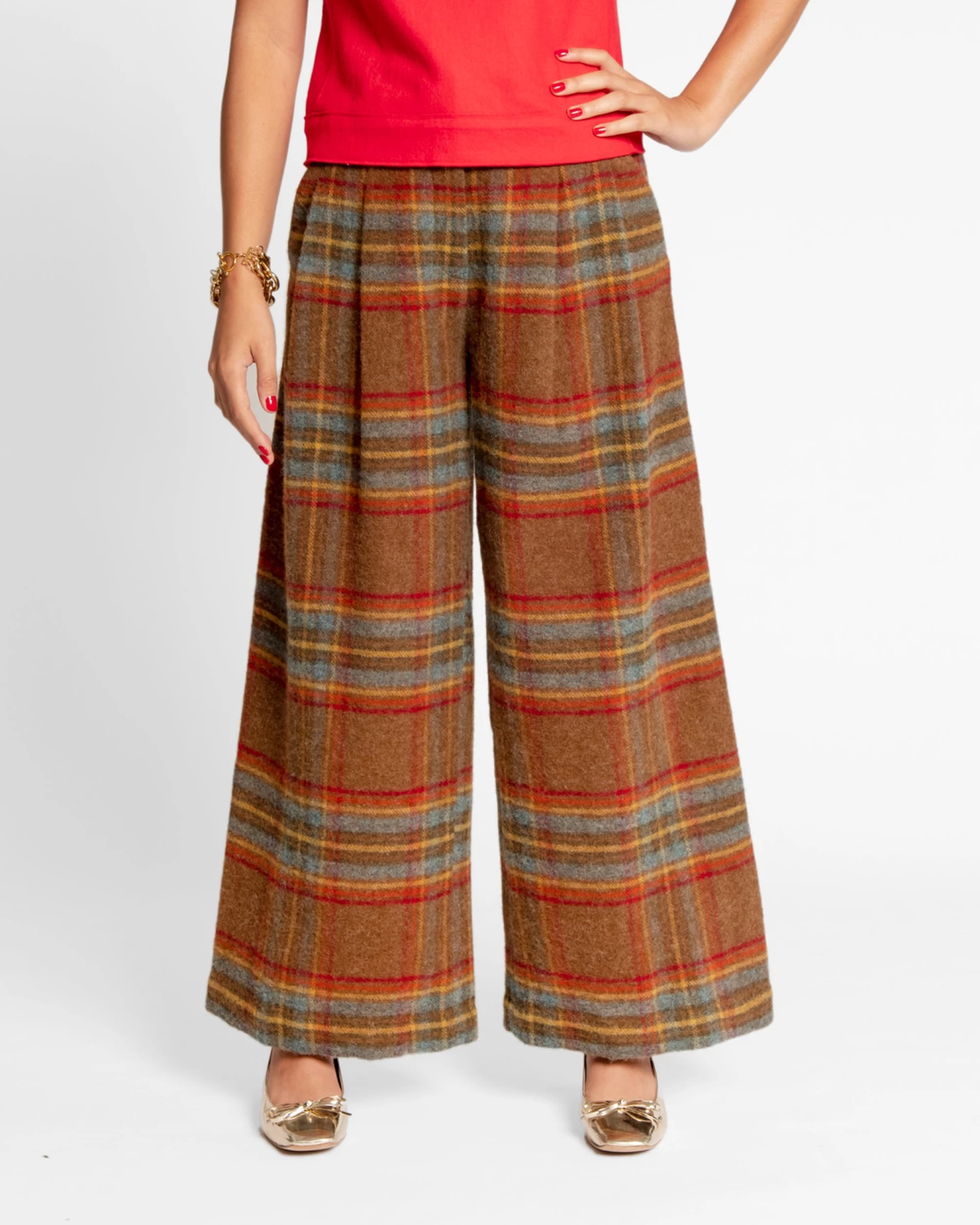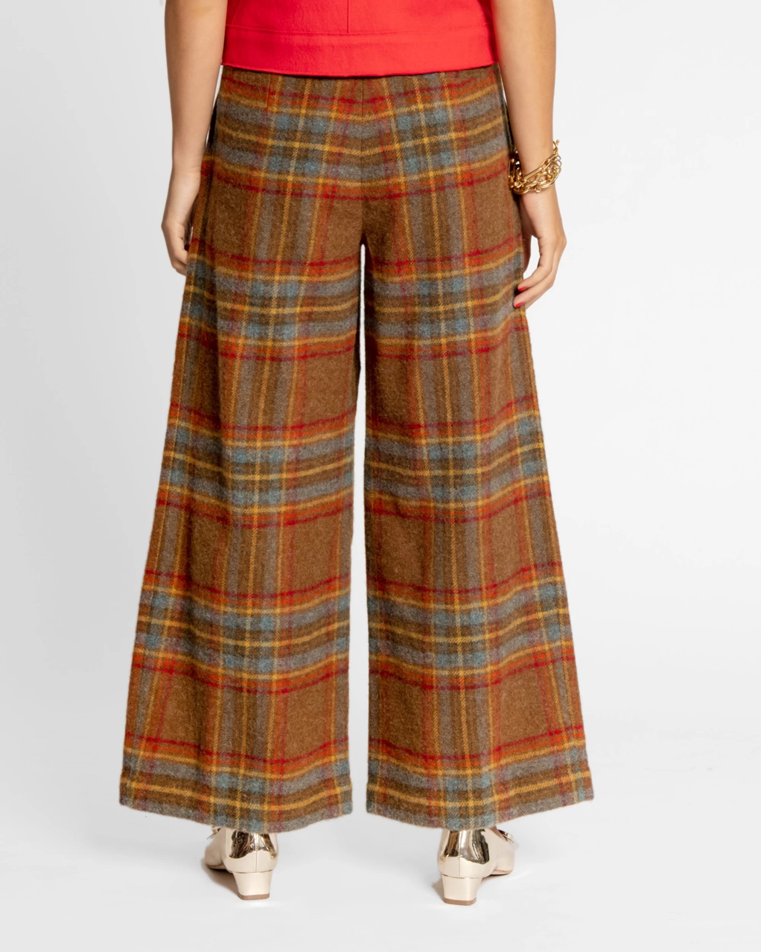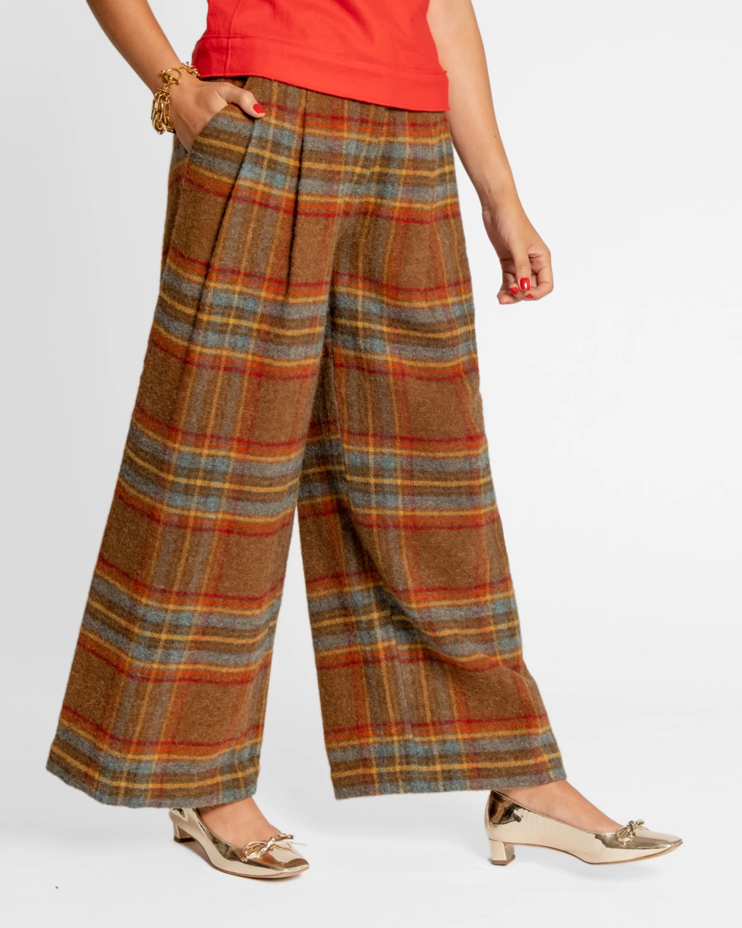 Introducing the Bossy Pant in Andrews Plaid, a piece whose name says it all. Feel like the Boss you are with these front pleated pants in turquoise. Pair with a button down top or sweater and a great pair of shoes. This silhouette may appear to be intimidating, but is actually very flattering on so many figures.Â