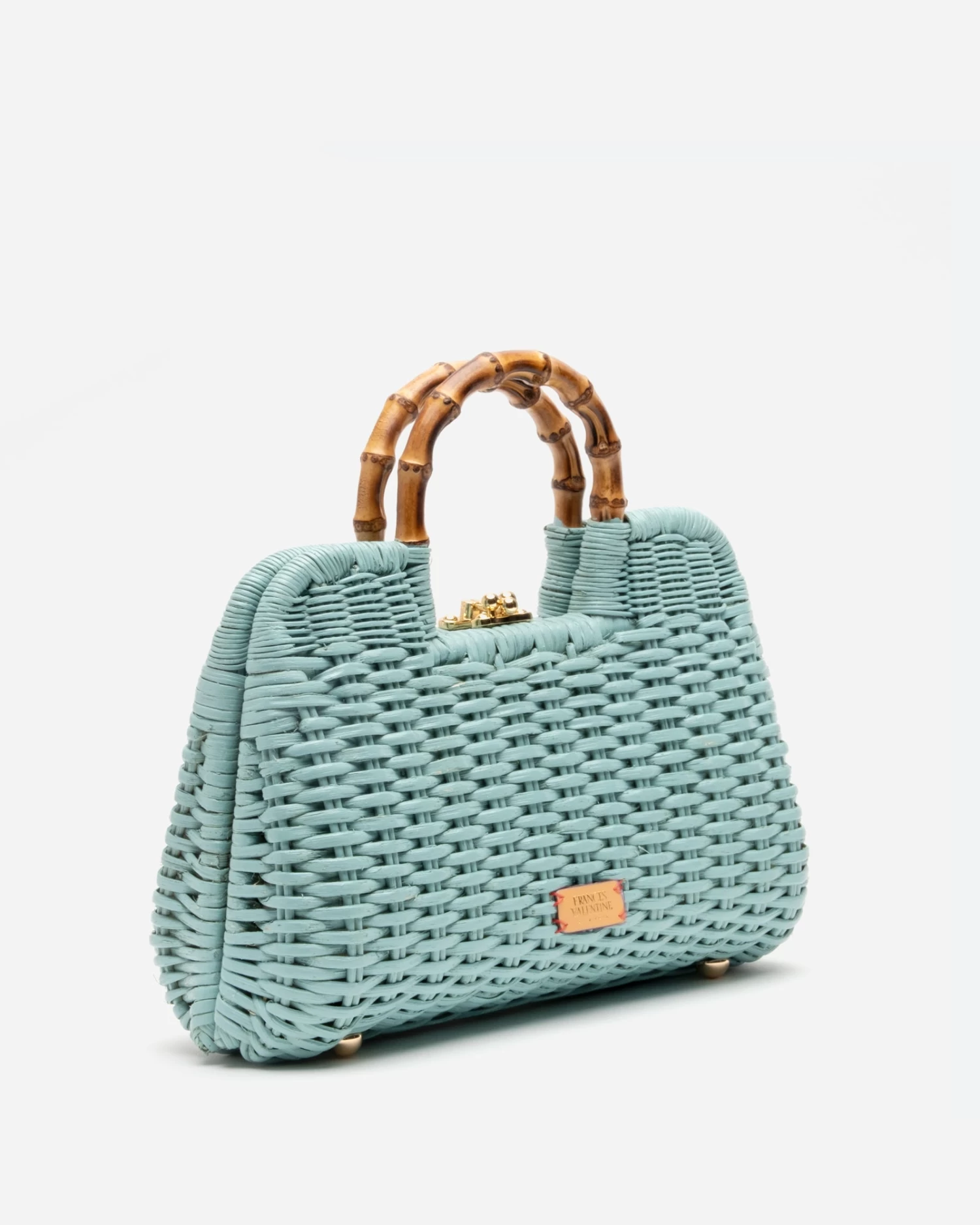 Hand woven painted wicker. Wooden bamboo handle. Metal ball & pin closure. Floral cotton twill lining. Interior zippered pocket. Metal feet.