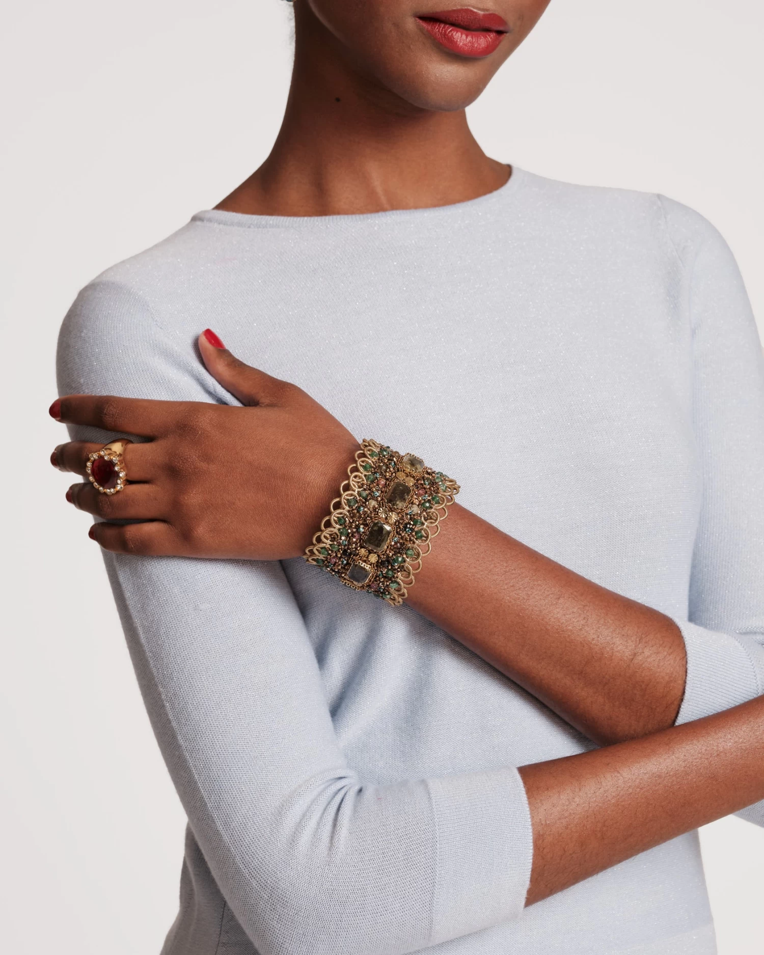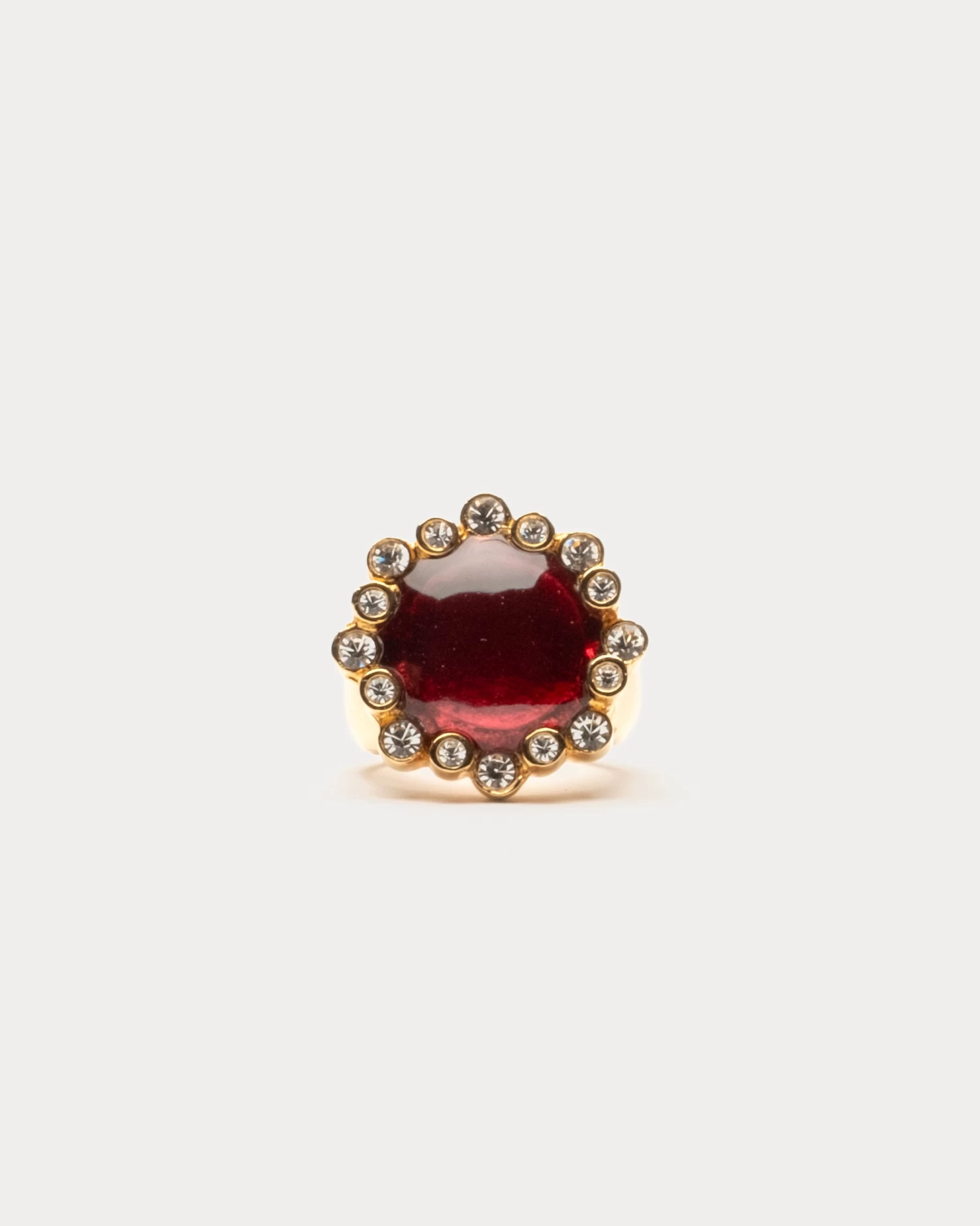 Your new favorite making statement ring this season will be the Circular Ruby Crystal Ring. This eye catching gold plated ring features a large ruby colored glass stone surrounded by clear gem stones. Who doesn’t love a pop of color and sparkle?