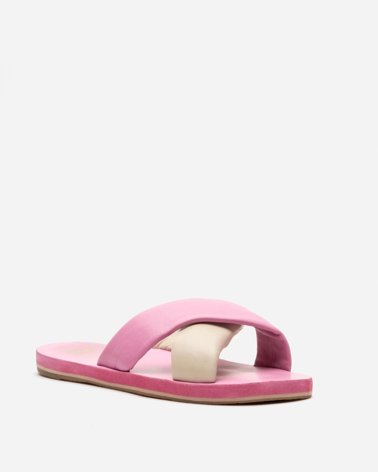 You will not want to take off our new Criss Cross Cloud Slide Sandals. Color blocked tubular straps made of soft nappa leather intertwine on these comfortable and stylish slides. Pair with any of our new dresses or tunics for the perfect sunny day look.