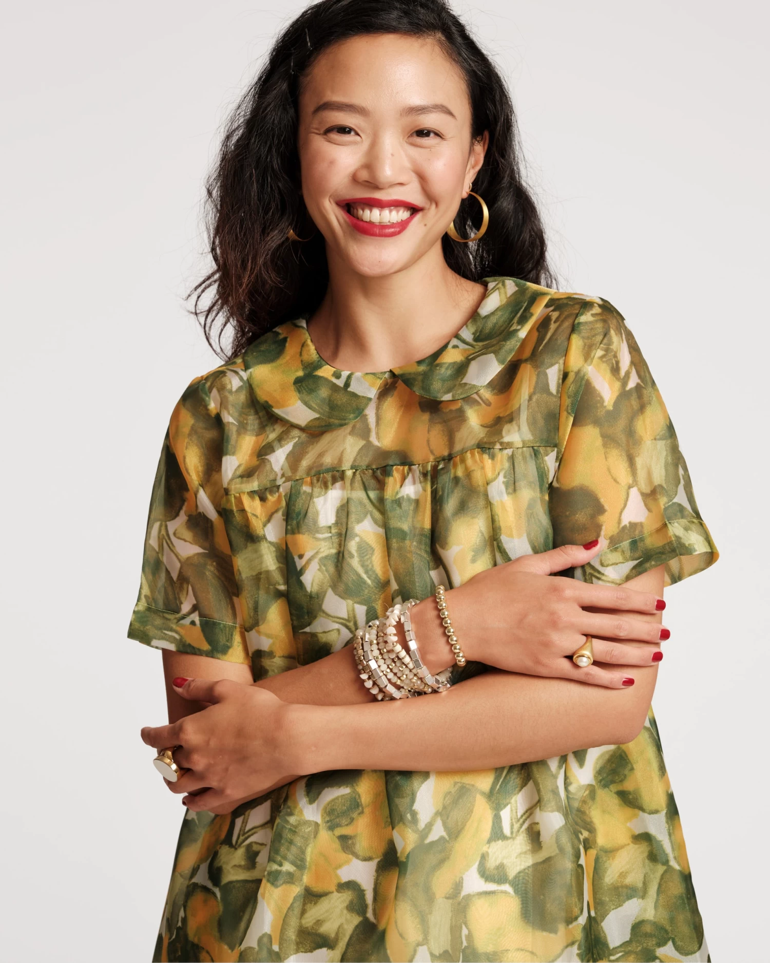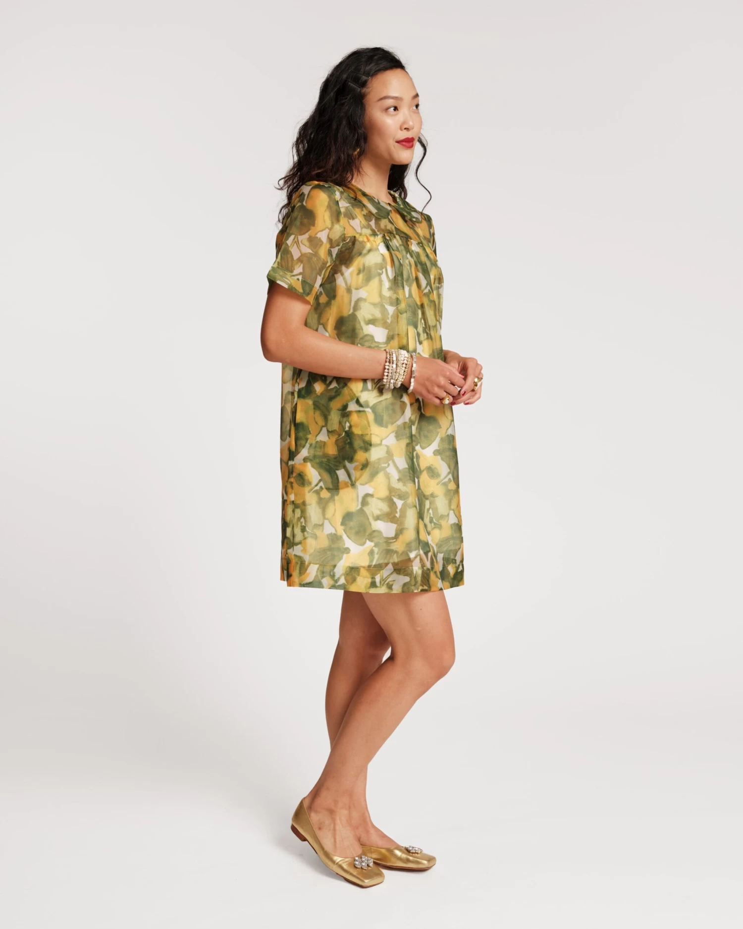 Oh, Darla! Darla is a short-sleeve babydoll silhouette with covered-button details, pockets, and an oversized peter pan collar. This sheer organza design features an adjustable slip attachment – for a layered yet lightweight dress style.