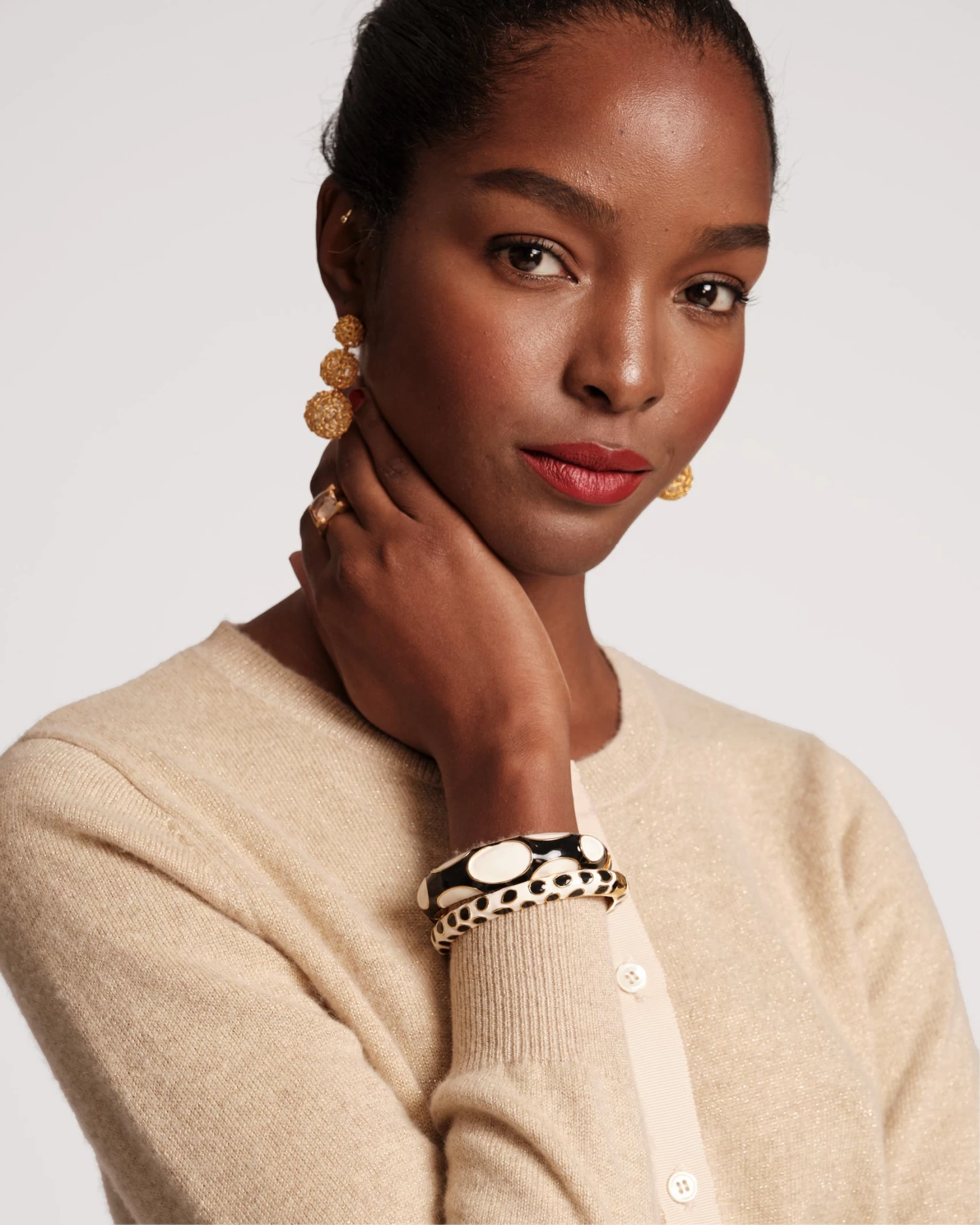 The enamel Large Polka Dot Bangle features a fun demoetric design. This delicate bangle is gold plated and features white enamel with black polka dot accents. Wear alone or layer for a stacked look.