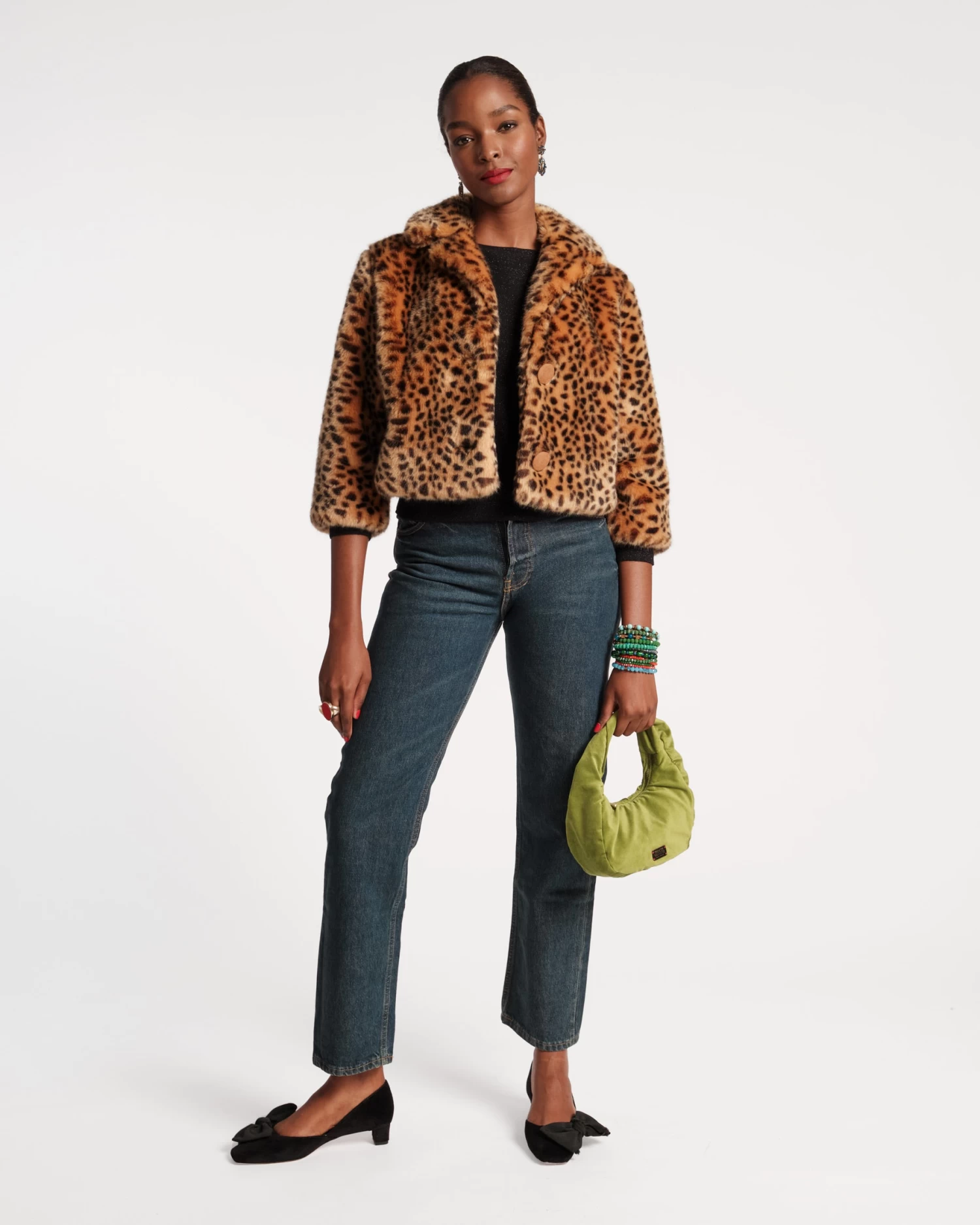 A fur coat never goes out of style. Our Erika Jacket is a classic, waist-length faux fur design with an oversized lapel collar, bracelet-length sleeves, and two front covered buttons for closure. Stay cozy and chic with this layer draped over your seasonal styles.