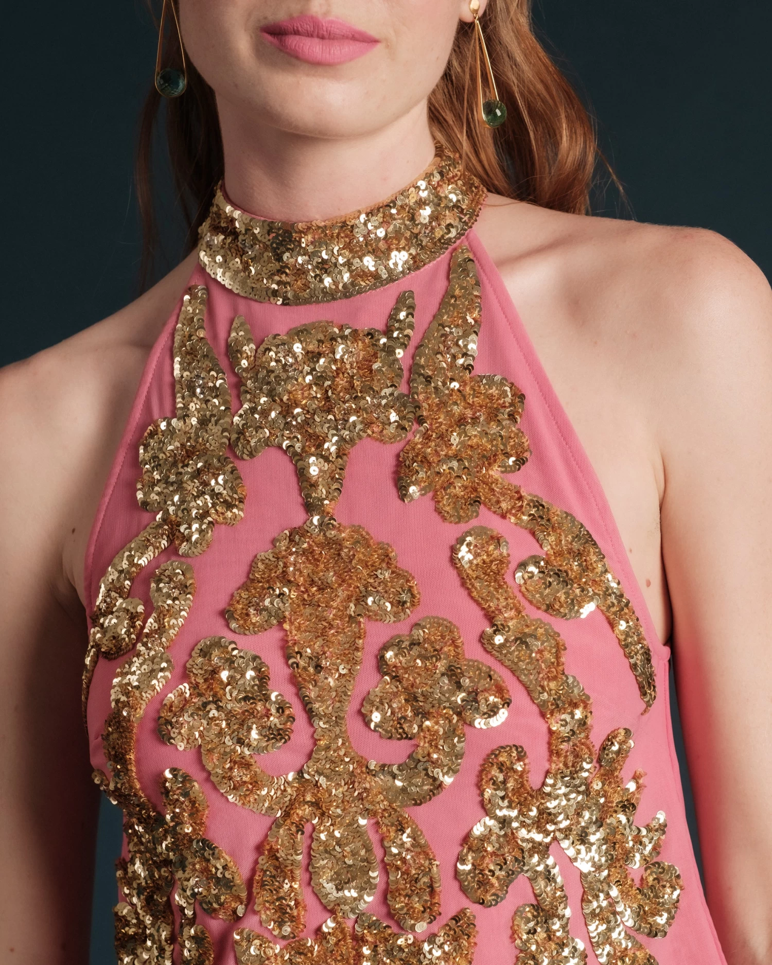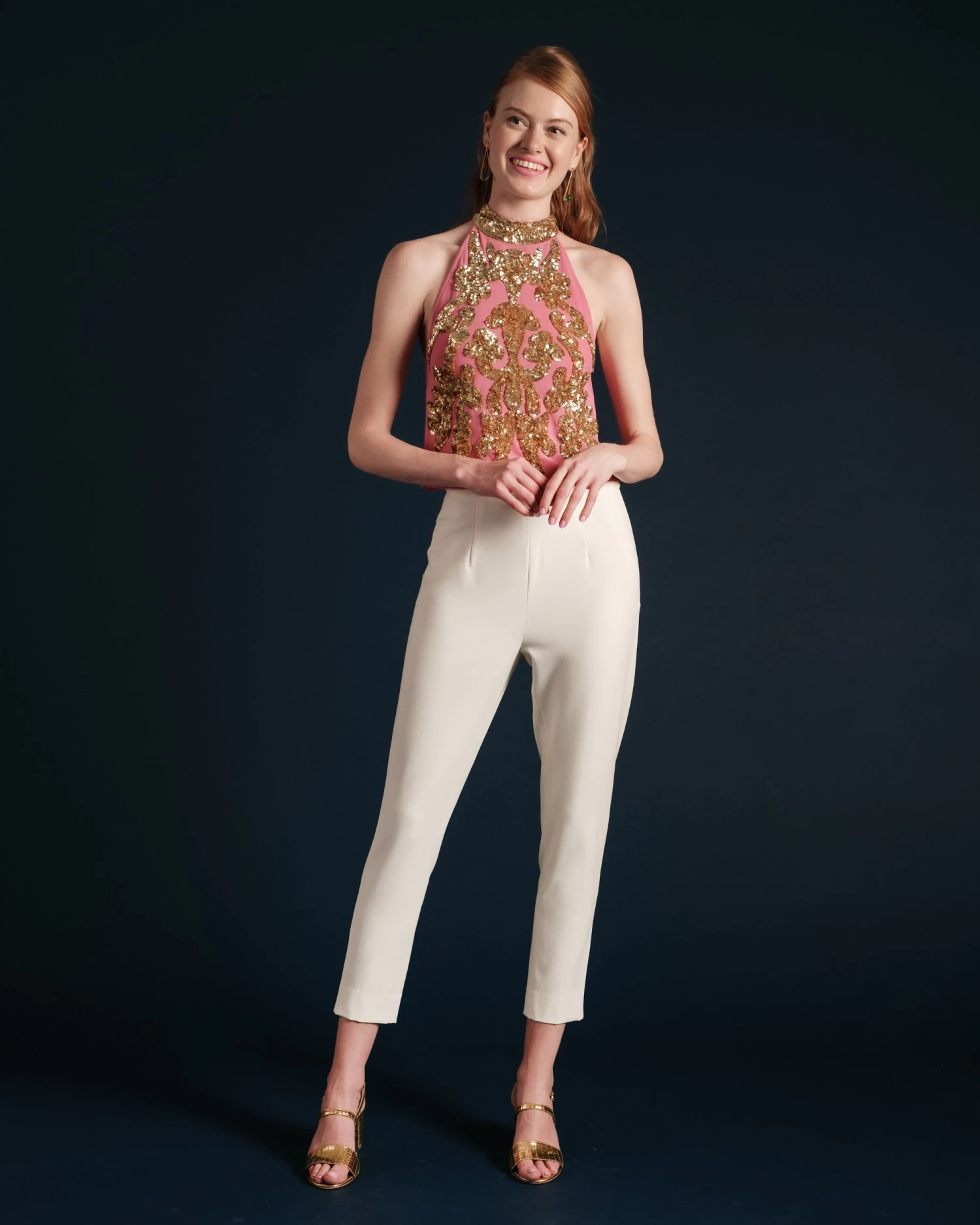 Divinely beautiful, our Goddess Top is a fitted, sleeveless top with a high neckline and hand sewn sequined design details. The ornate fabric shimmers like a chandelier and drapes smoothly like silk – a confident style choice for galas or cocktail parties. Fashion this piece with a simple clutch and favorite bottoms to make an unforgettable statement.