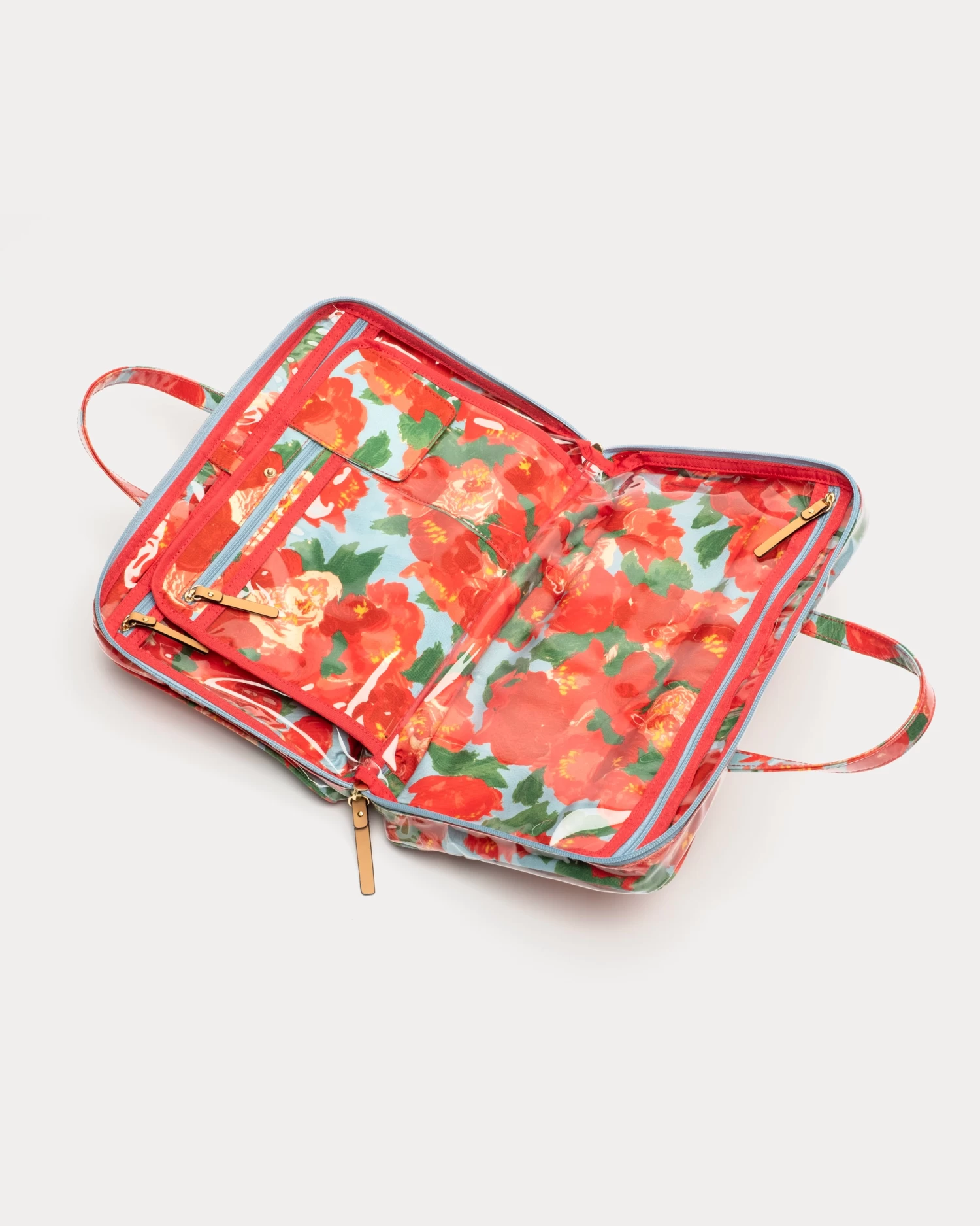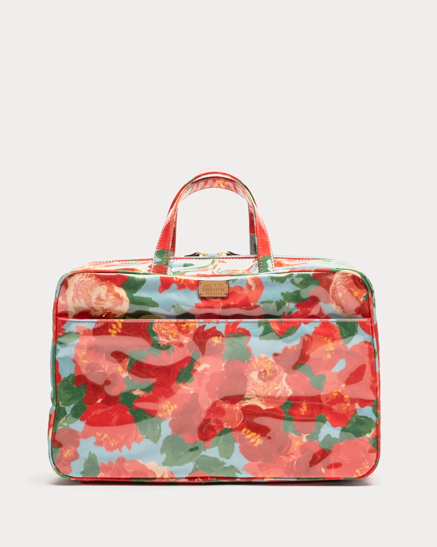 Peony print. Waterproof PVC exterior and interior. Interior cotton twill lining. Exterior zip pocket. Dual interior zip pockets. Middle divider with with dual zipper pockets and toothbrush compartment.
