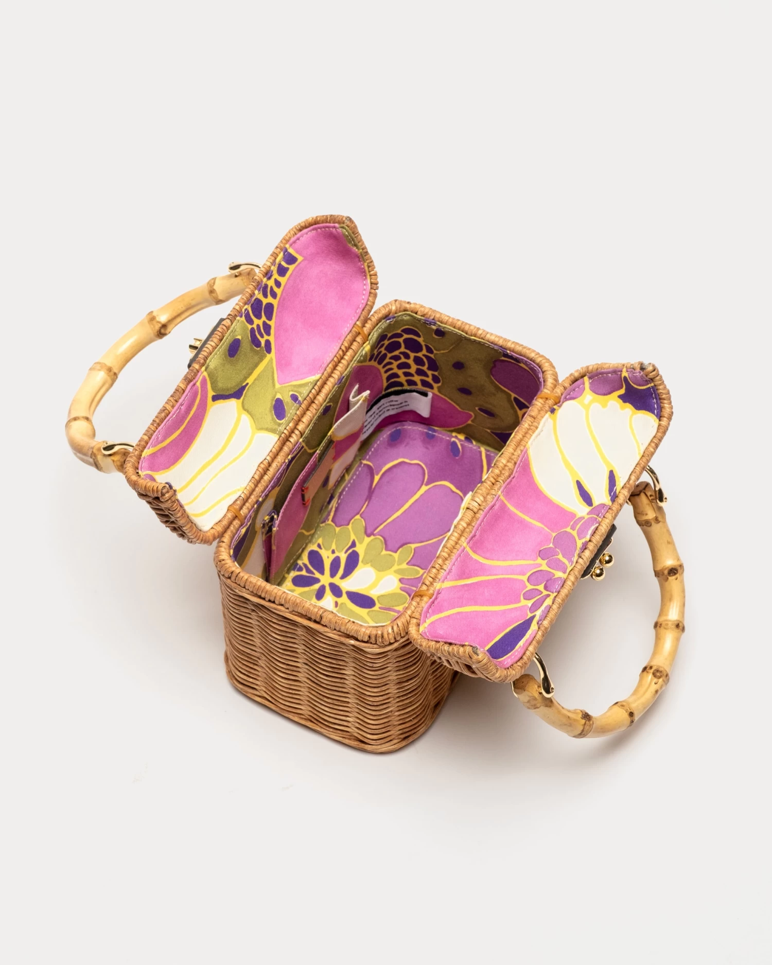 Wicker basket with bamboo handle. Pin clasp closure. Floral printed cotton lining. Detachable and adjsutable crossbody strap.Â