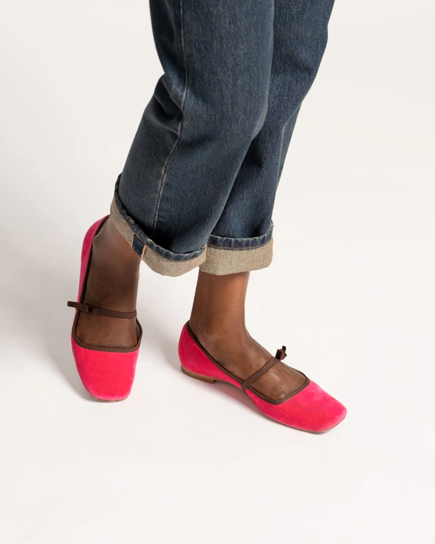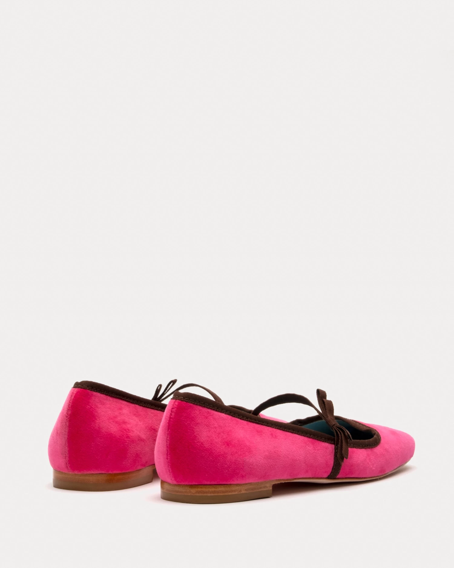 Velvet flat with elastic bow strap. Squared toe. Leather sole.