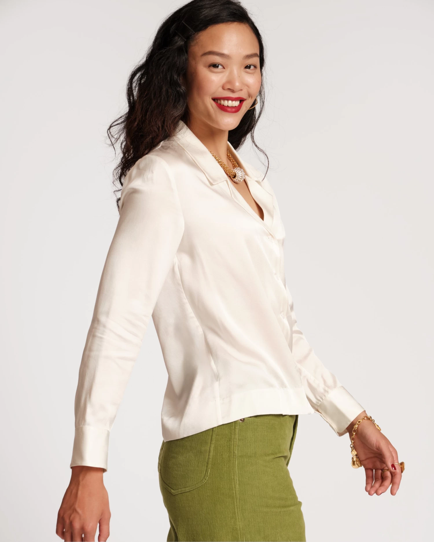 Inspired by Katherine Hepburn’s confident 20th-century women style – our Katherine Top is a 100% silk button-up with a sharp notch collar, three-button cuffs, and pleat details. This blouse pairs powerfully with high waisted trousers or an oversized blazer for sophisticated yet romantic looks.