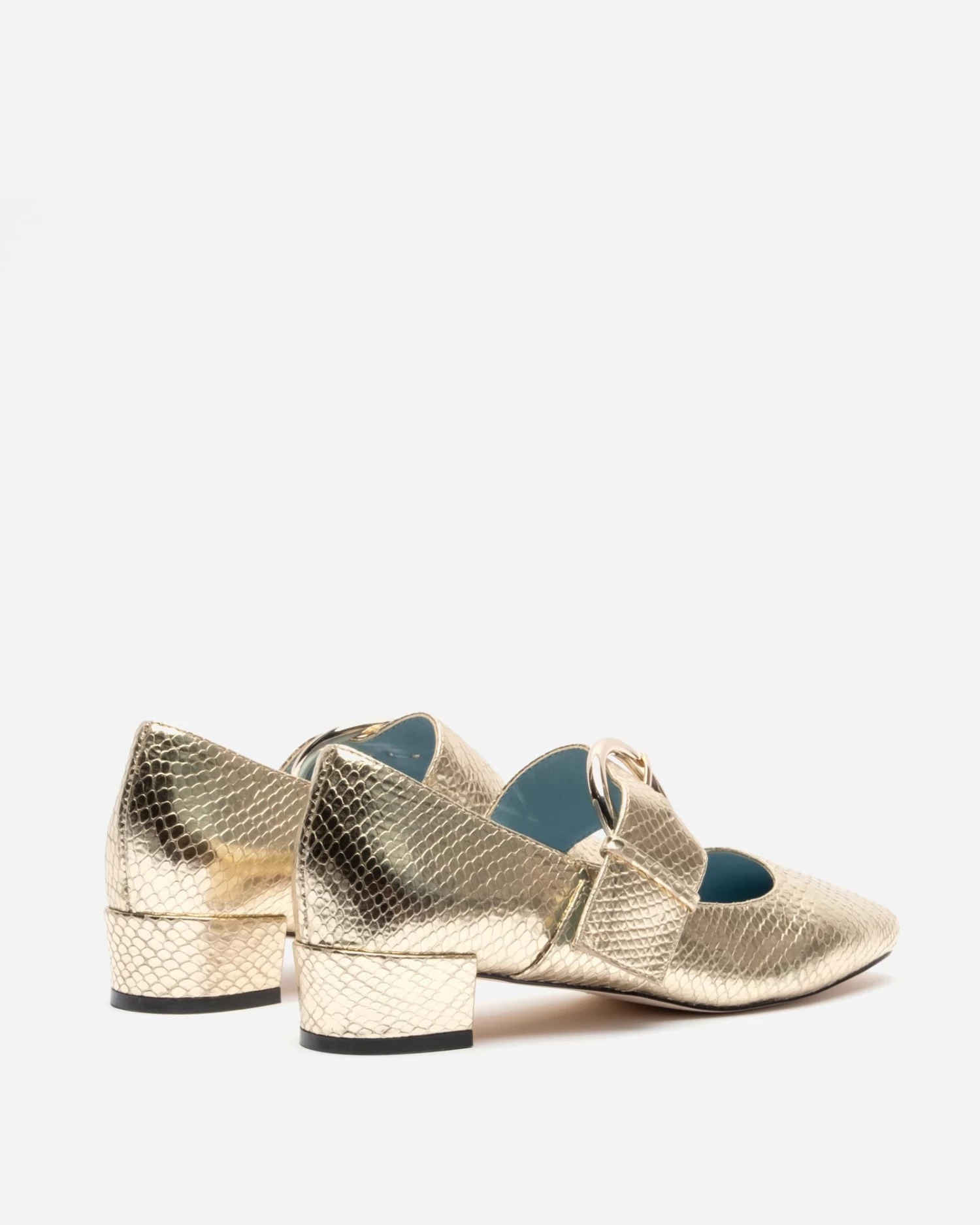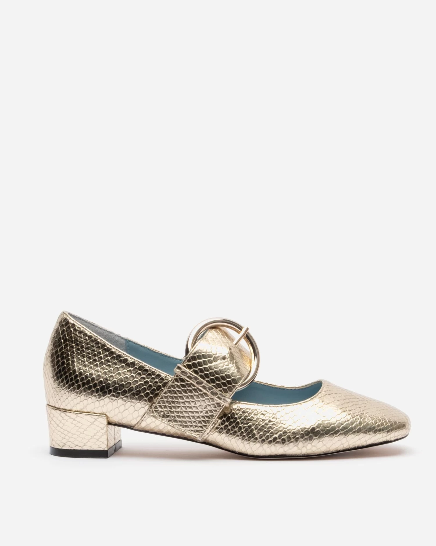 Katy, our original favorite go to Mary Jane with wide strap and a leather covered heel. Platino snake embossed leather will help add a touch of shimmer and shine to your look.