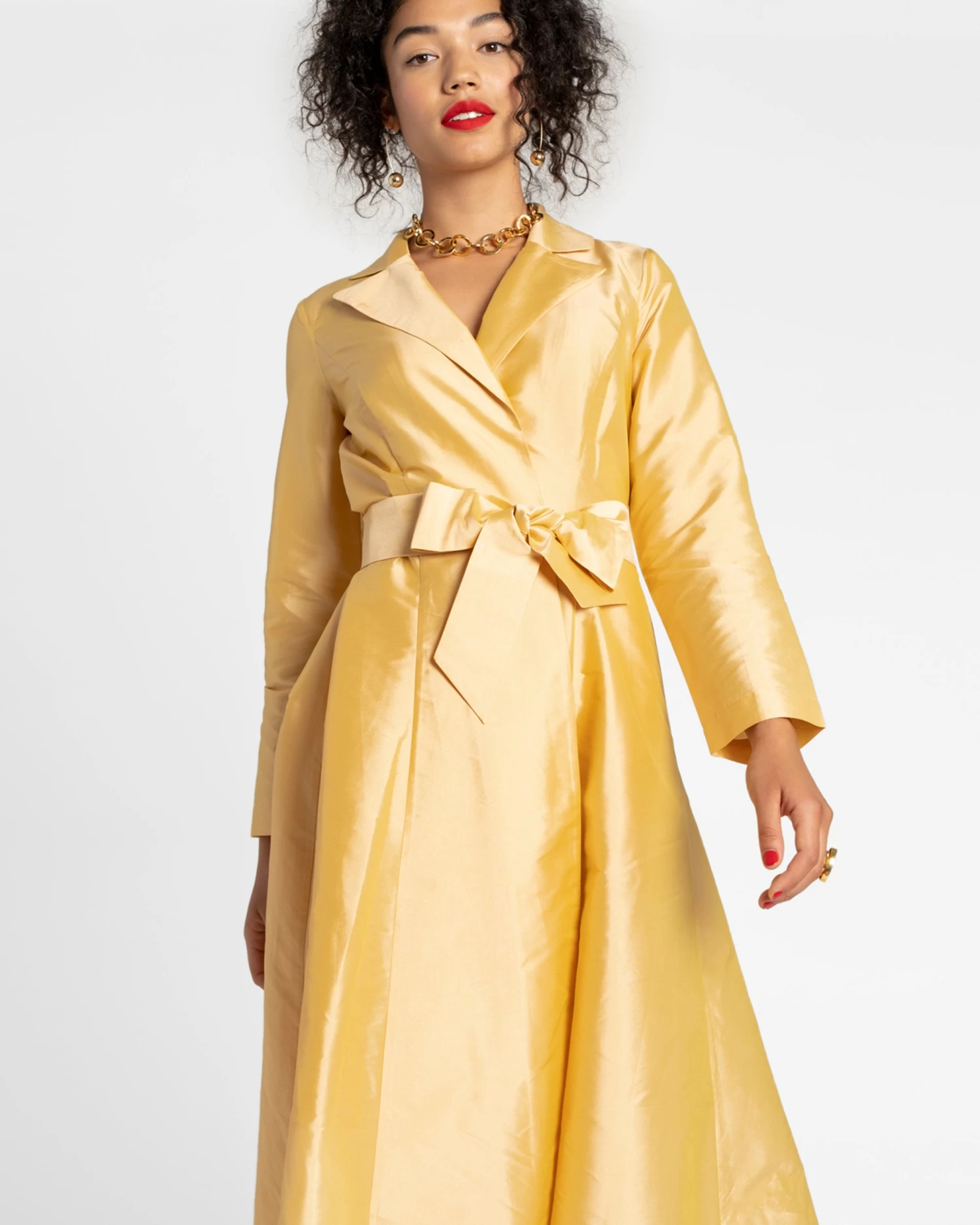 Inspired by one of our favorites, Lucille Ball, the Lucille Wrap Dress is a super versatile dress that can be worn with or without a slip and with or without pants, depending on your whim! It has a hidden self tie inside and a self belt to wear outside for a secure fit. This dress comes in red, navy and gold and has a full midi-length skirt.