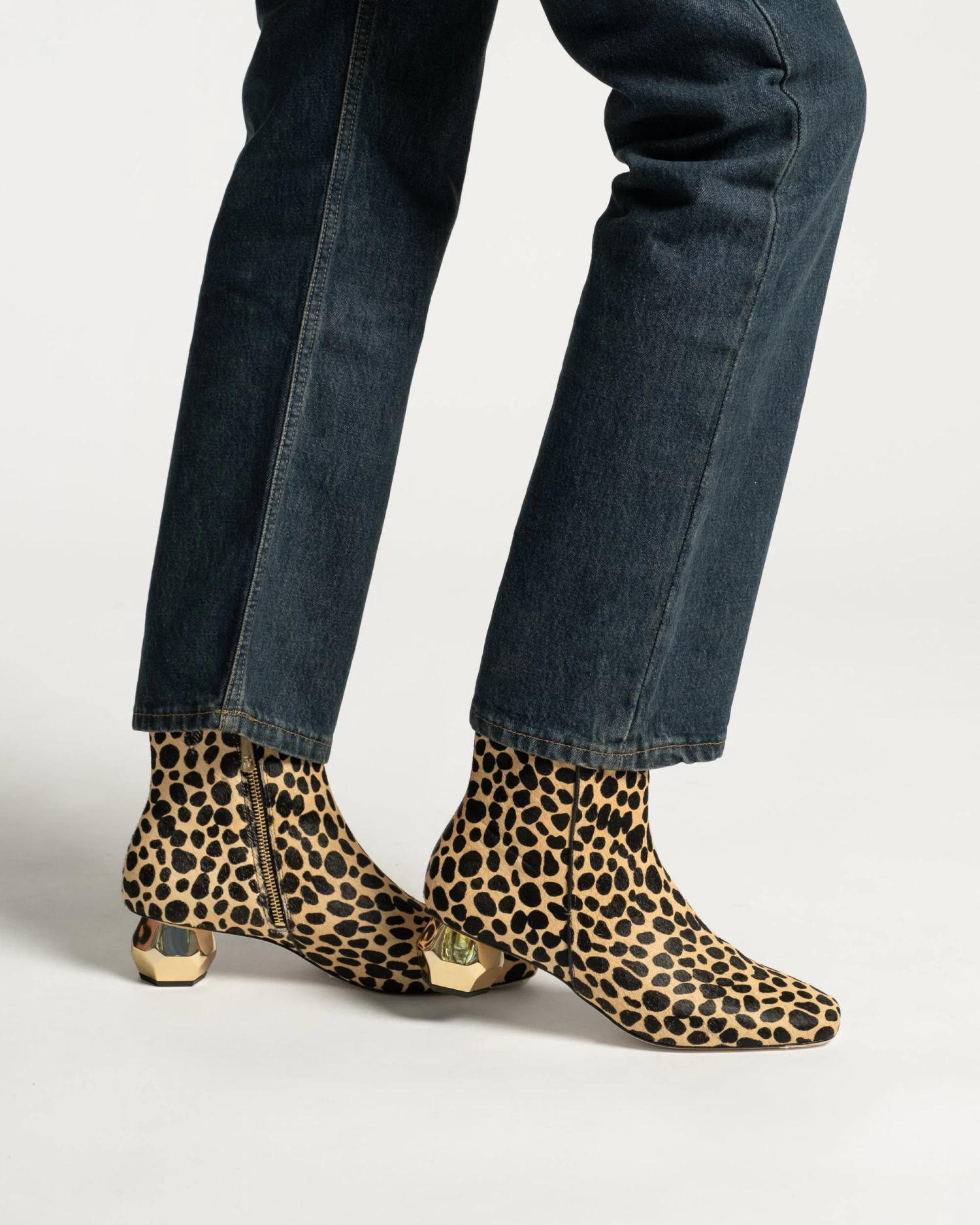 Marnie, our cheetah printed haircalf mid-heel bootie features our patented signature heel inspired by Buckminster Fuller’s omni-triangulated geodesic dome.