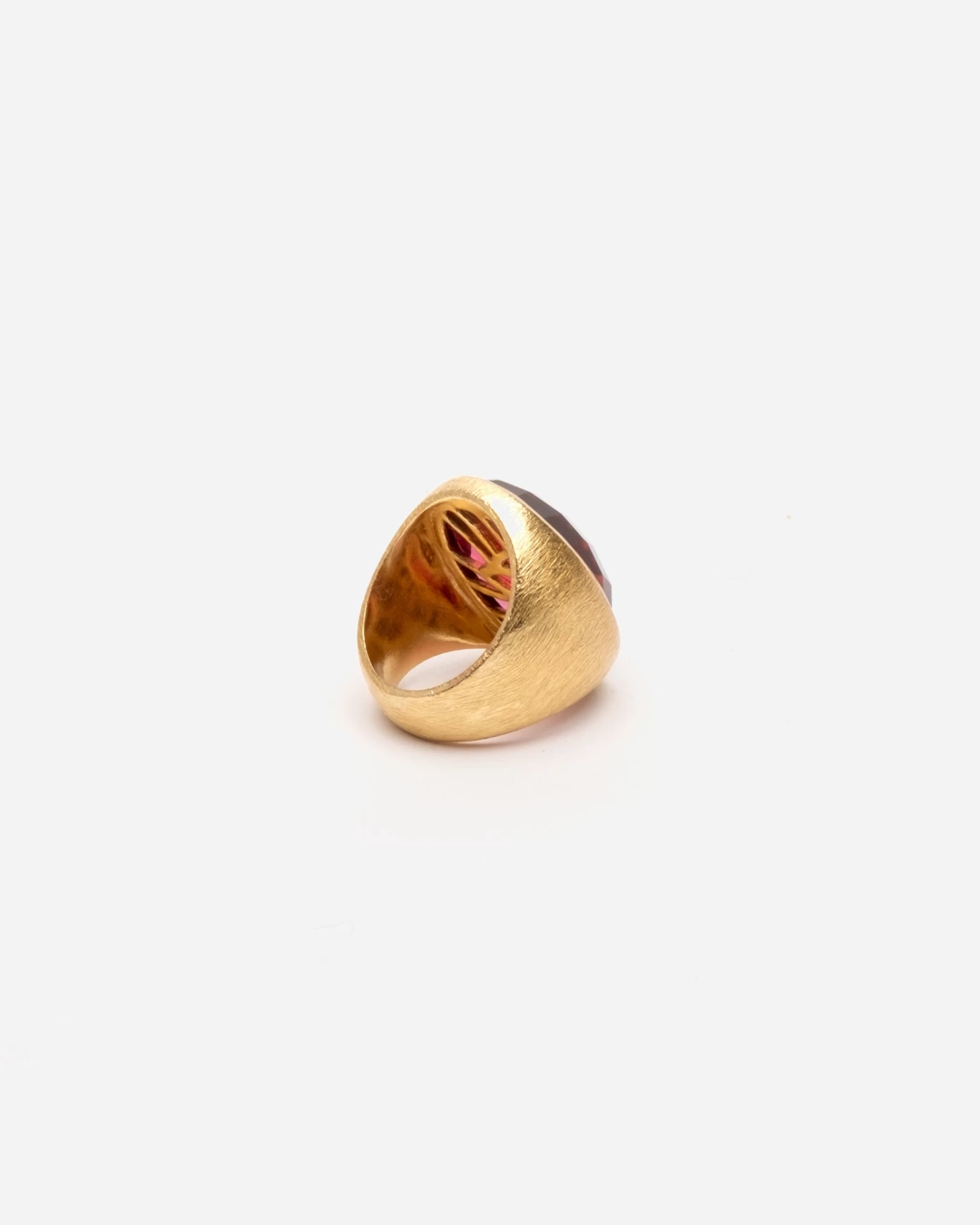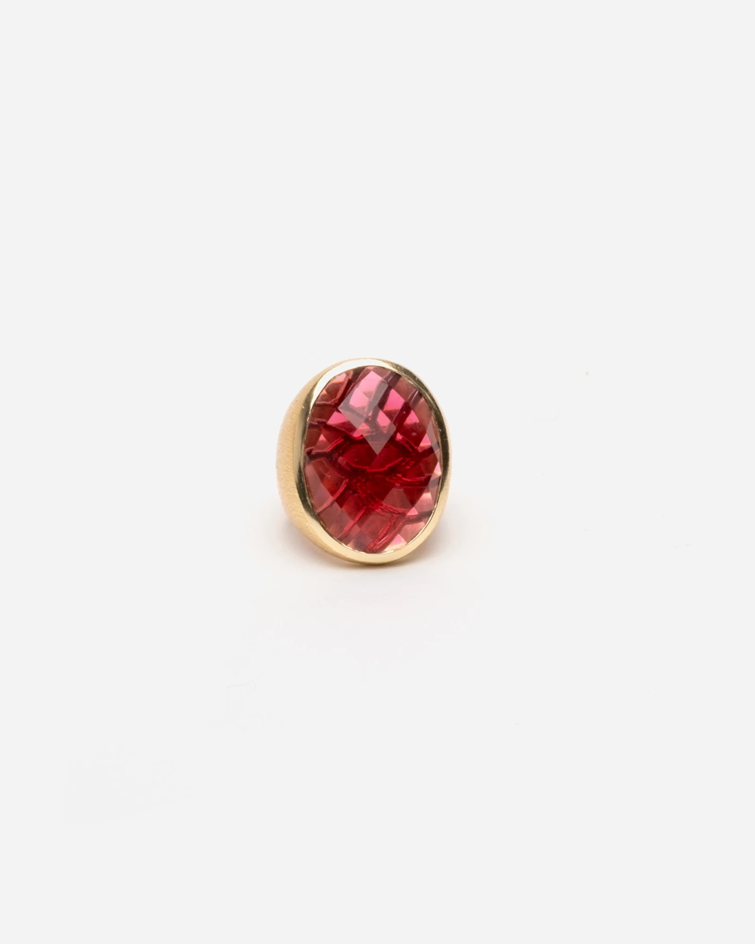The Marzia Statement Ring features a mother of pearl base stone with crystal red tourmaline on top, creating the perfect shade.