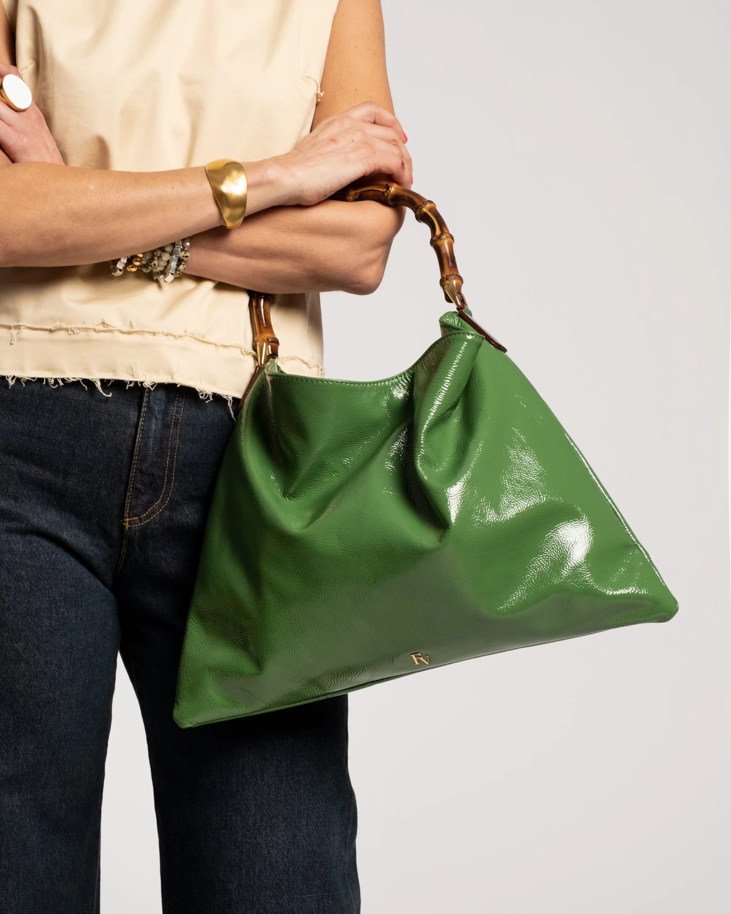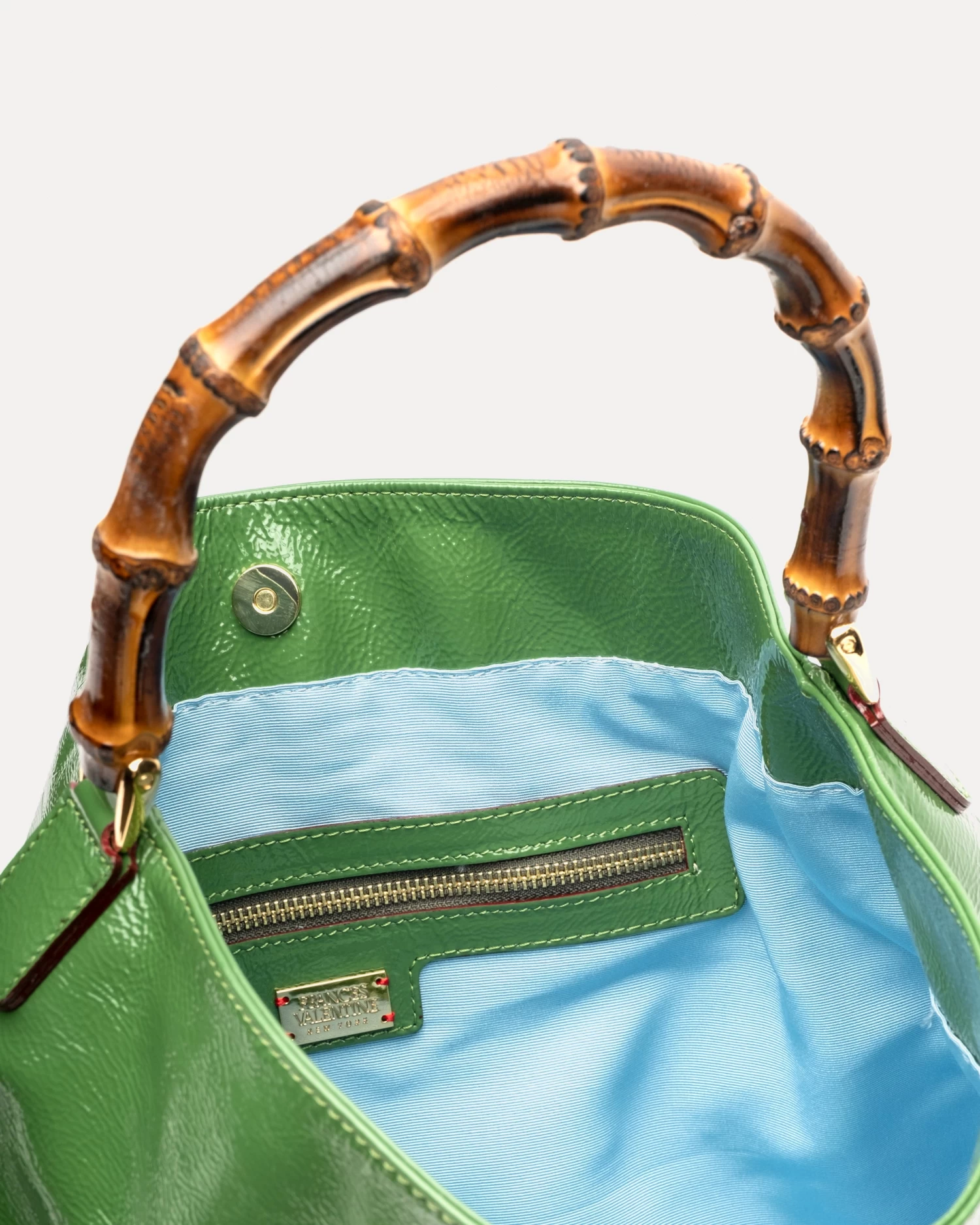 The Muriel Tote in Italian Naplak Leather is our go-to handbag this season for spacious style. With a textured bamboo handle and shiny leather frame – this piece offers the perfect mix of slouch and structure, exuding effortless elegance when toting your daily essentials.