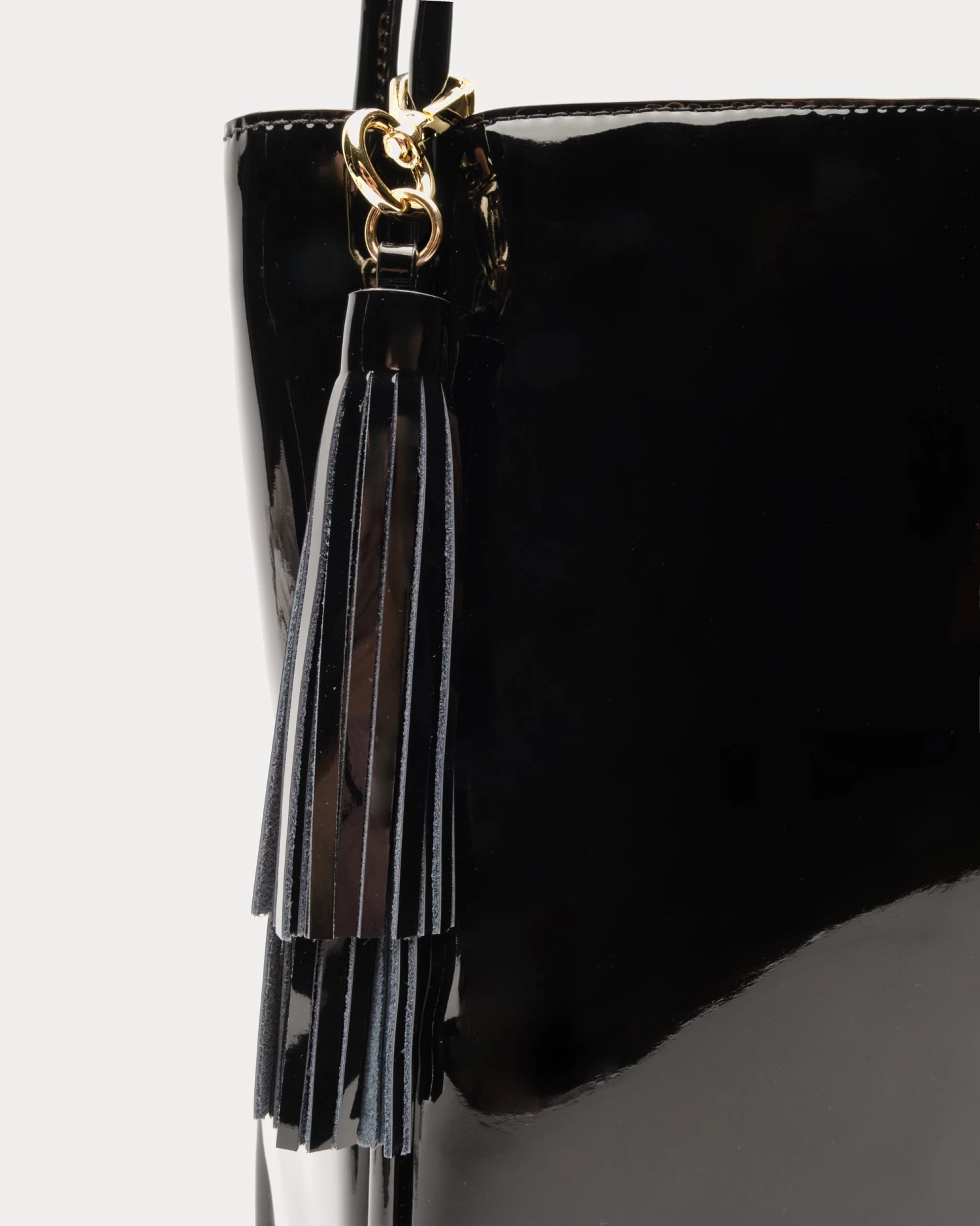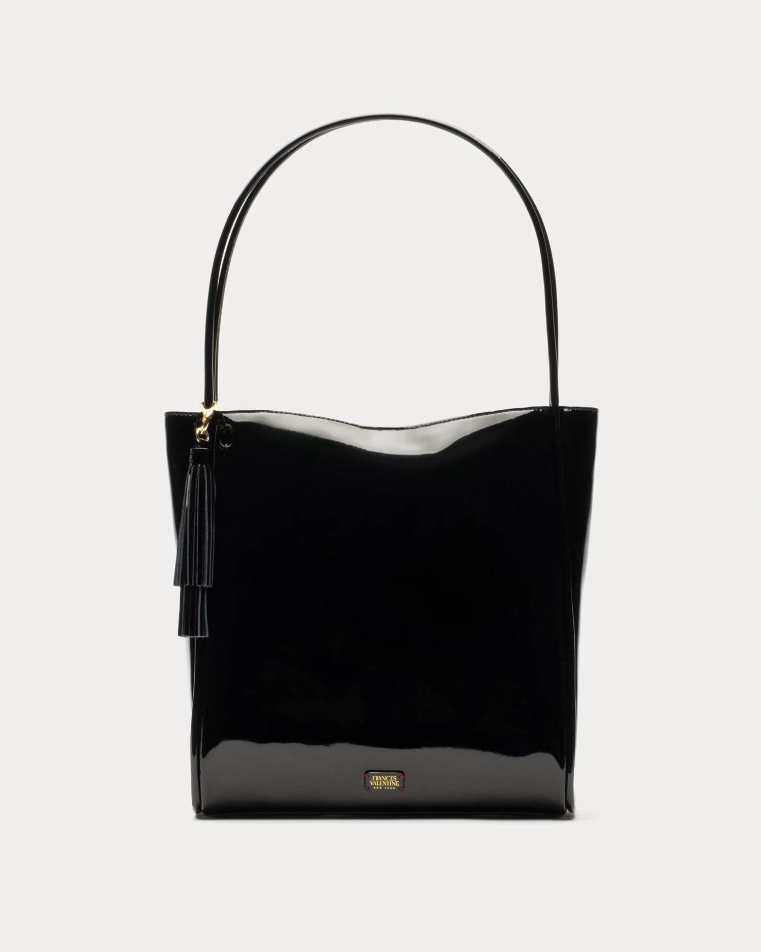 Everything fits in with our Nan Tote in Soft Patent. Crafted with a simple square design made with shiny leather, thin double straps, and a matching tassel detail – this structured handbag is your most spacious style companion.