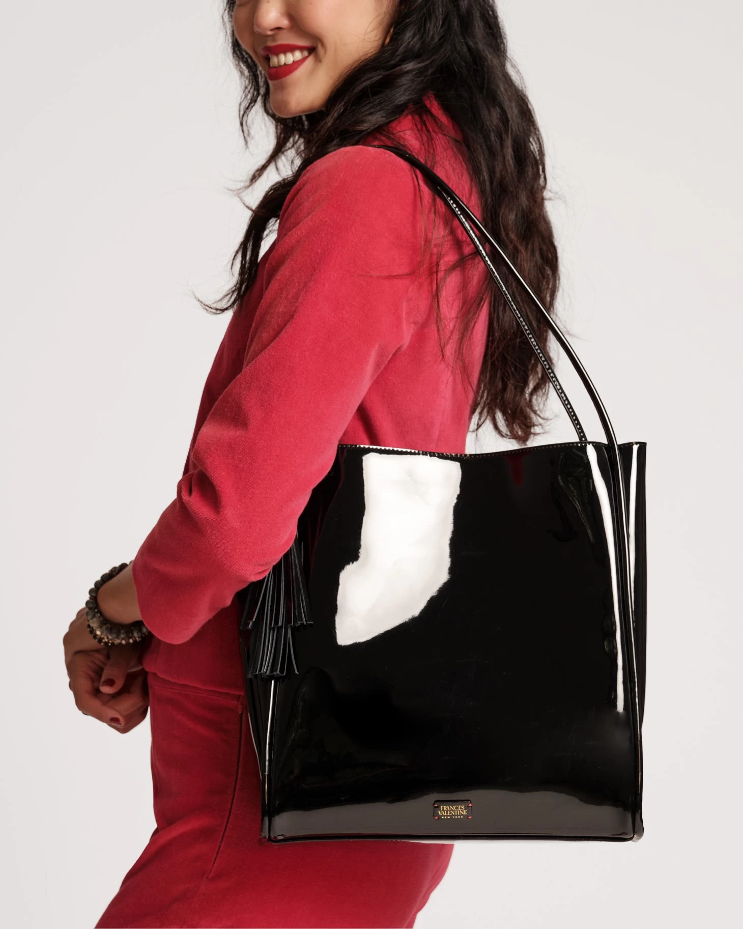 Patent leather tote. Interior slip and zippered pockets. Detachable patent leather tassel keychain. Brushed cotton twill lining.