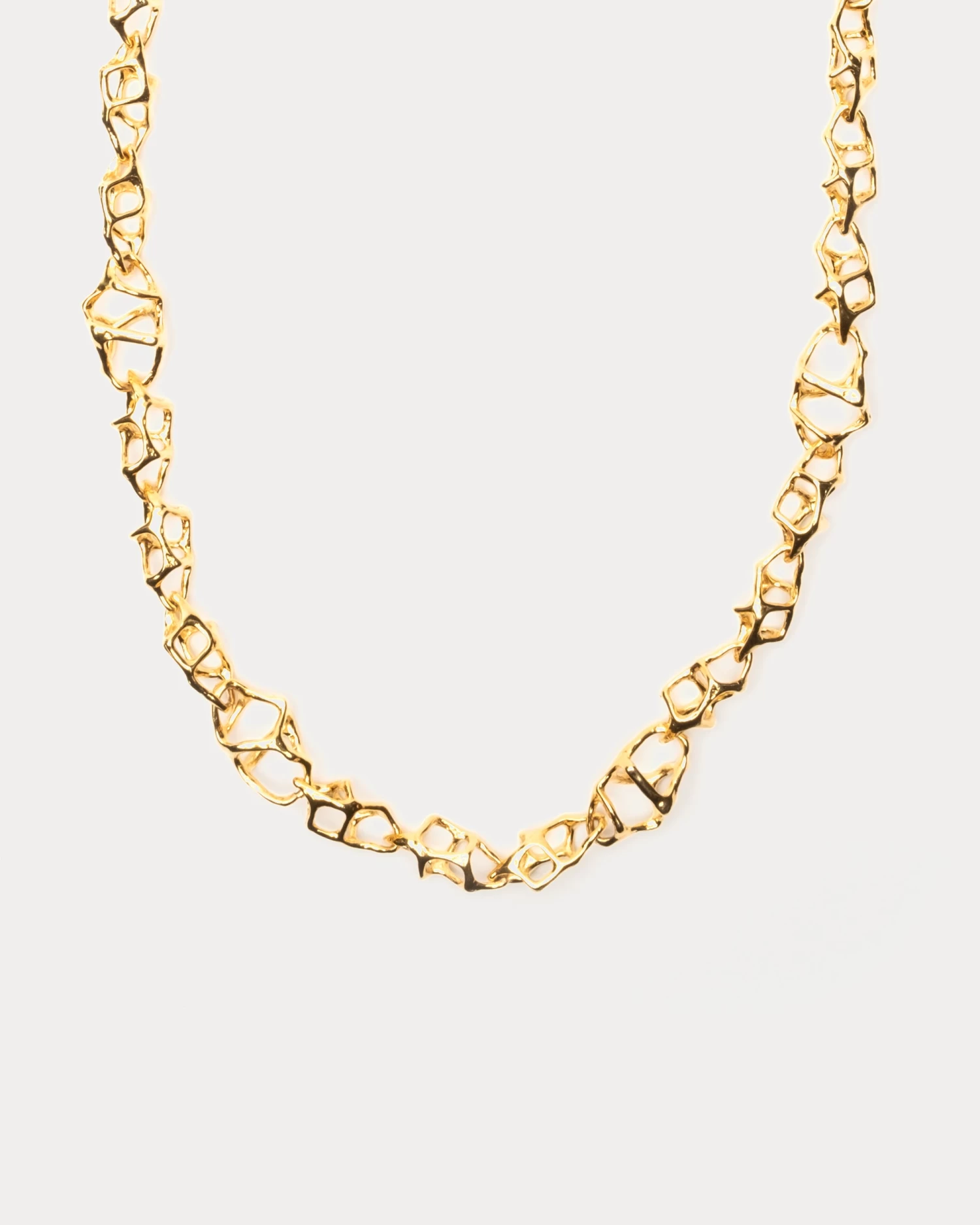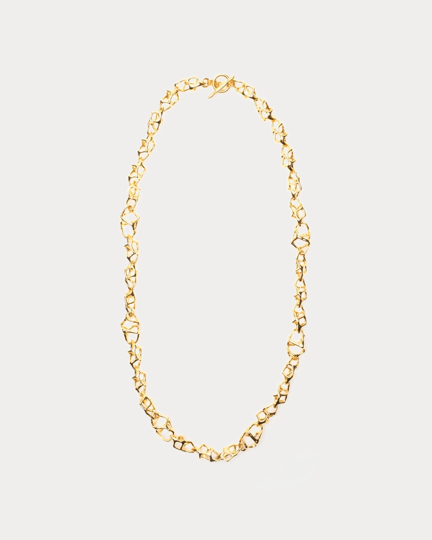 The Open Cage Link Necklace is a timeless piece that will never go out of style. The necklace features a sturdy gold link chain that is 30 inches long. The chain is finished with a lobster claw clasp for secure closure.