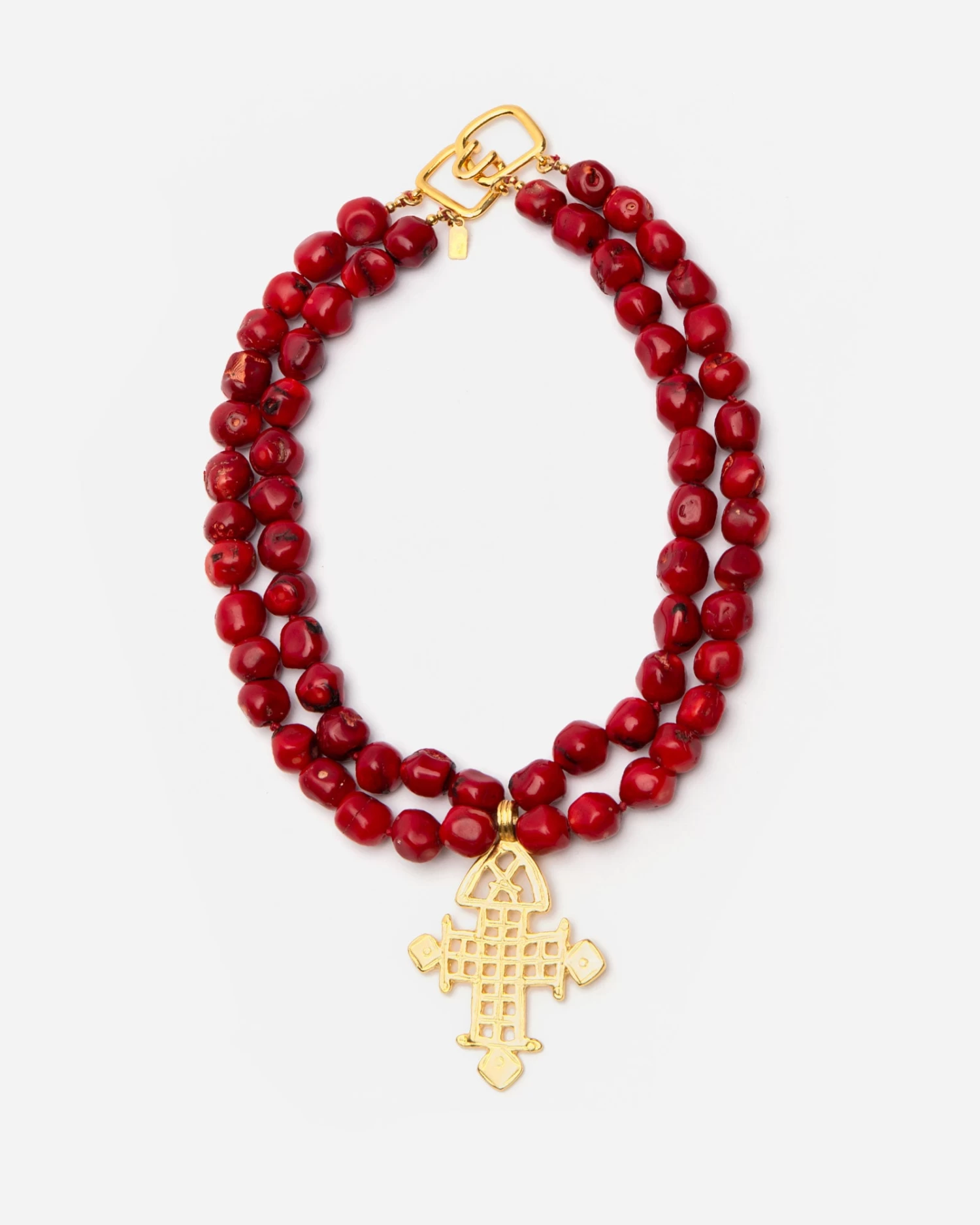 Cutout cross on red beaded necklace. Hook-loop closure.