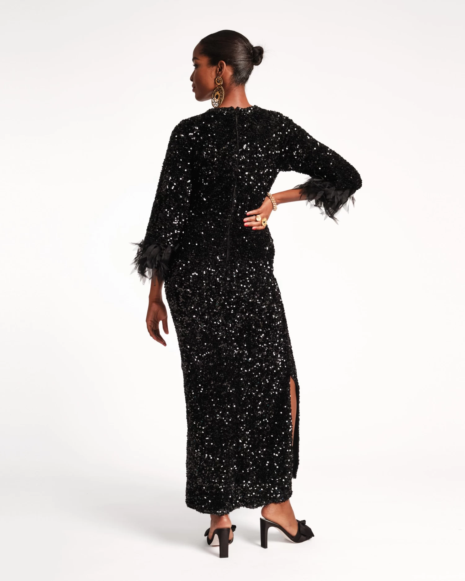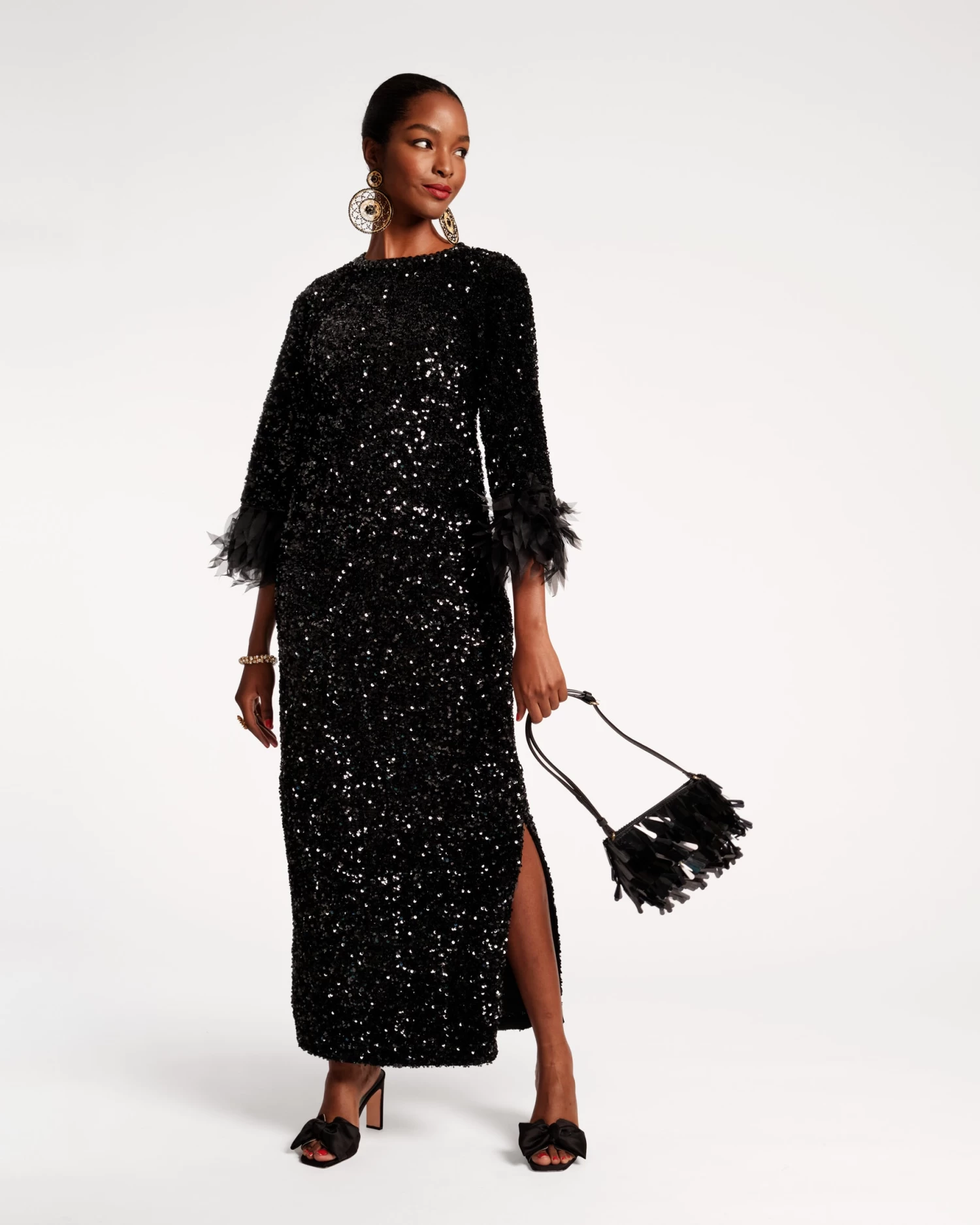 A formal dress to remember, Regina is our straight-cut, slim-fitting maxi dress with a rounded beaded neckline, ¾-length sleeves, and stretchy hand-sequined fabric. This comfortable women’s dress features hidden pockets and a mixed-texture design, detailed with organza feather cuffs!