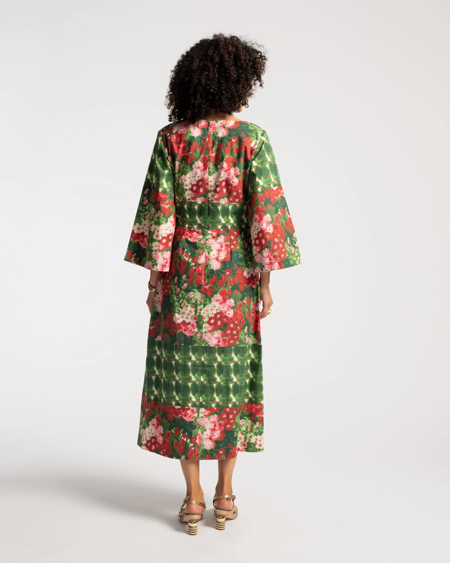 Shimmy is our flowy yet fitted dress design with decorative metal buttons and a back zipper. Detailed with a bold fabric print, this maxi dress has wide mid-length sleeves and a deep V-neck. Enjoy breezy summer days and dance-filled evenings in this fit!