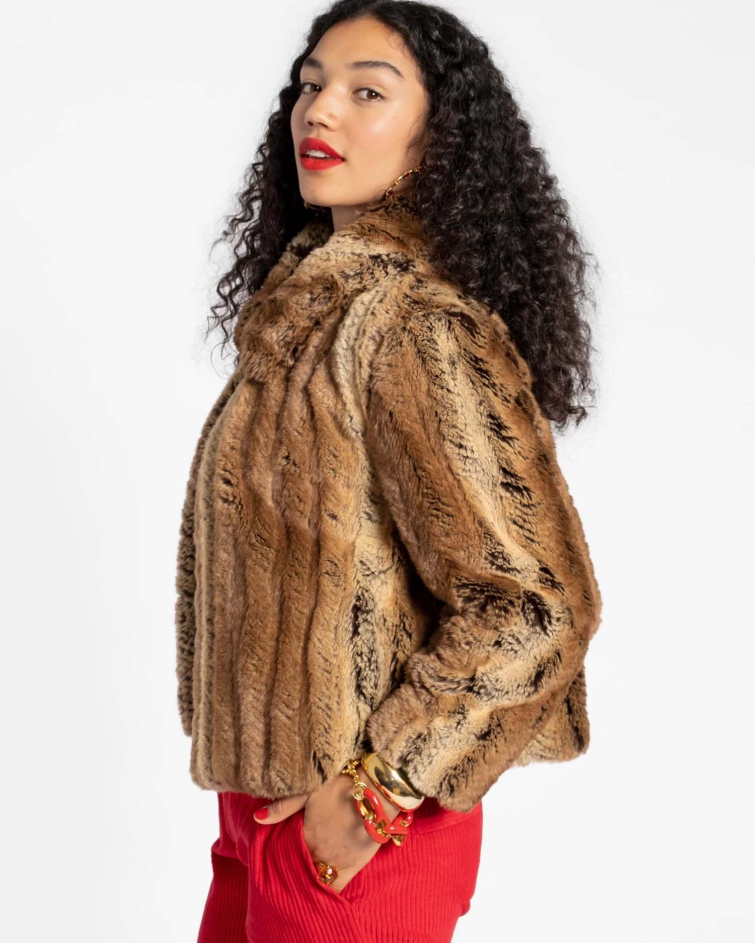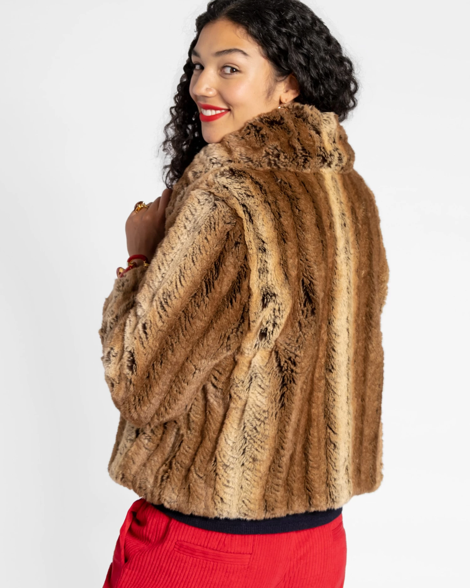 Instantly upgrade your wardrobe with our Short Faux Fur Jacket in chevron stripe print, a jacket that offers luxurious warmth and style. Pair with any of our sweaters, a statement necklace, your favorite cropped denim, and a pair of boots to complete your look.