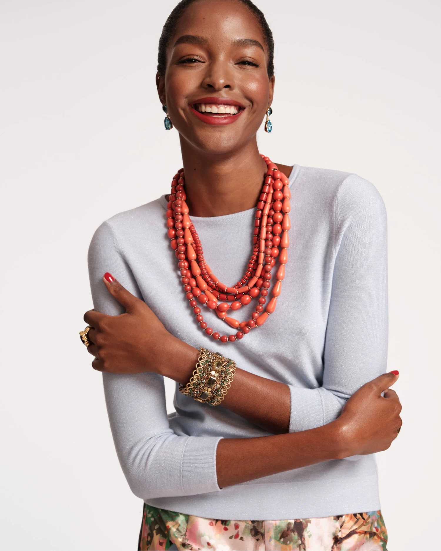 Multiple strands of orange wooden beads are layered together to make up the Simone Statement Necklace. Each strand features a different shape and size bead. Hung on a toggle closure, the length of the necklace is made to be shorter to accentuate your neckline.