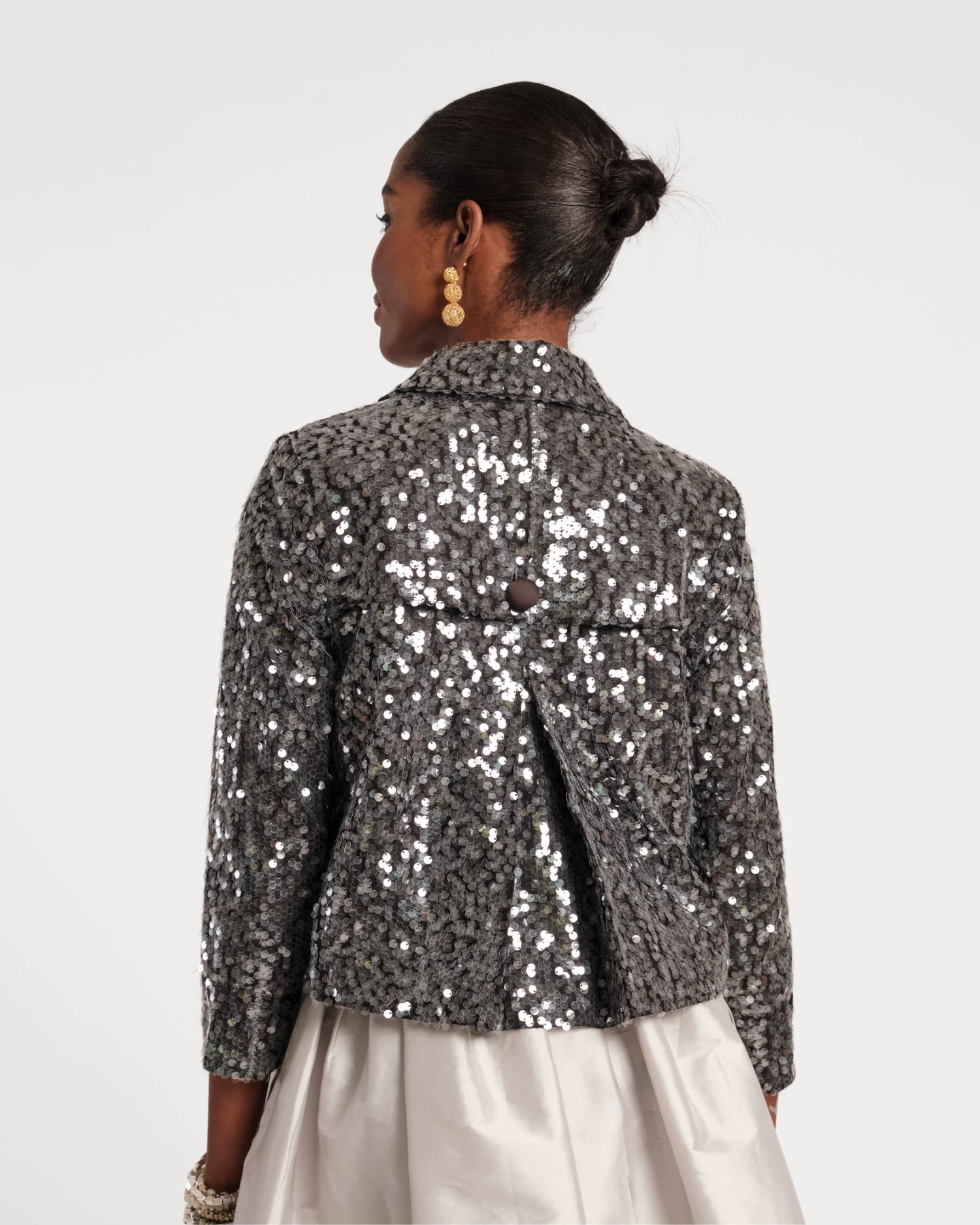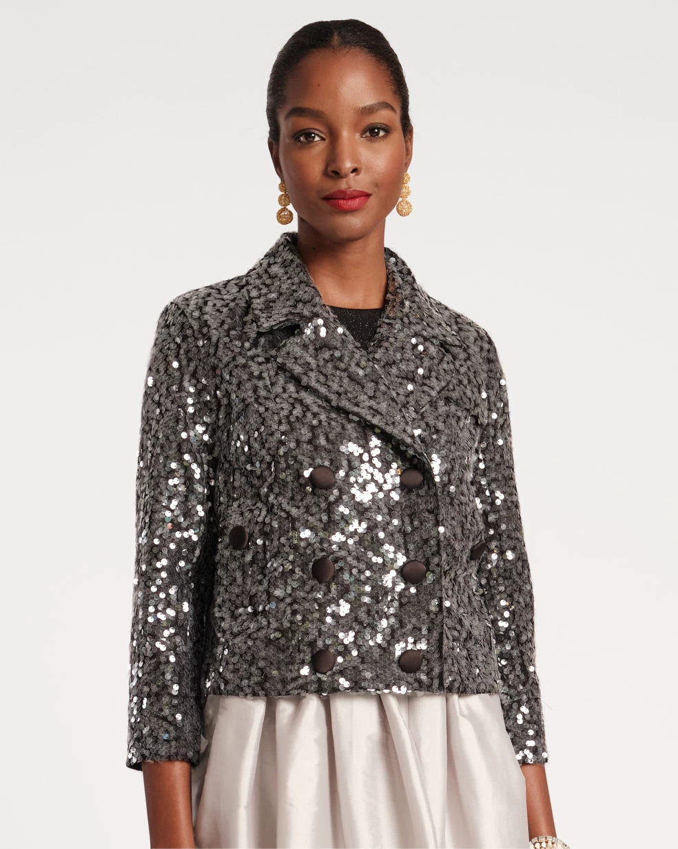 The life of the party – our Sloan Moto Jacket is a sequined statement layer with a lapel collar, double-breasted front, bracelet-length sleeves, contrast buttons, and pockets. Shimmering with every move, this women’s moto jacket design hits just above the waist to show off your occasion wear.