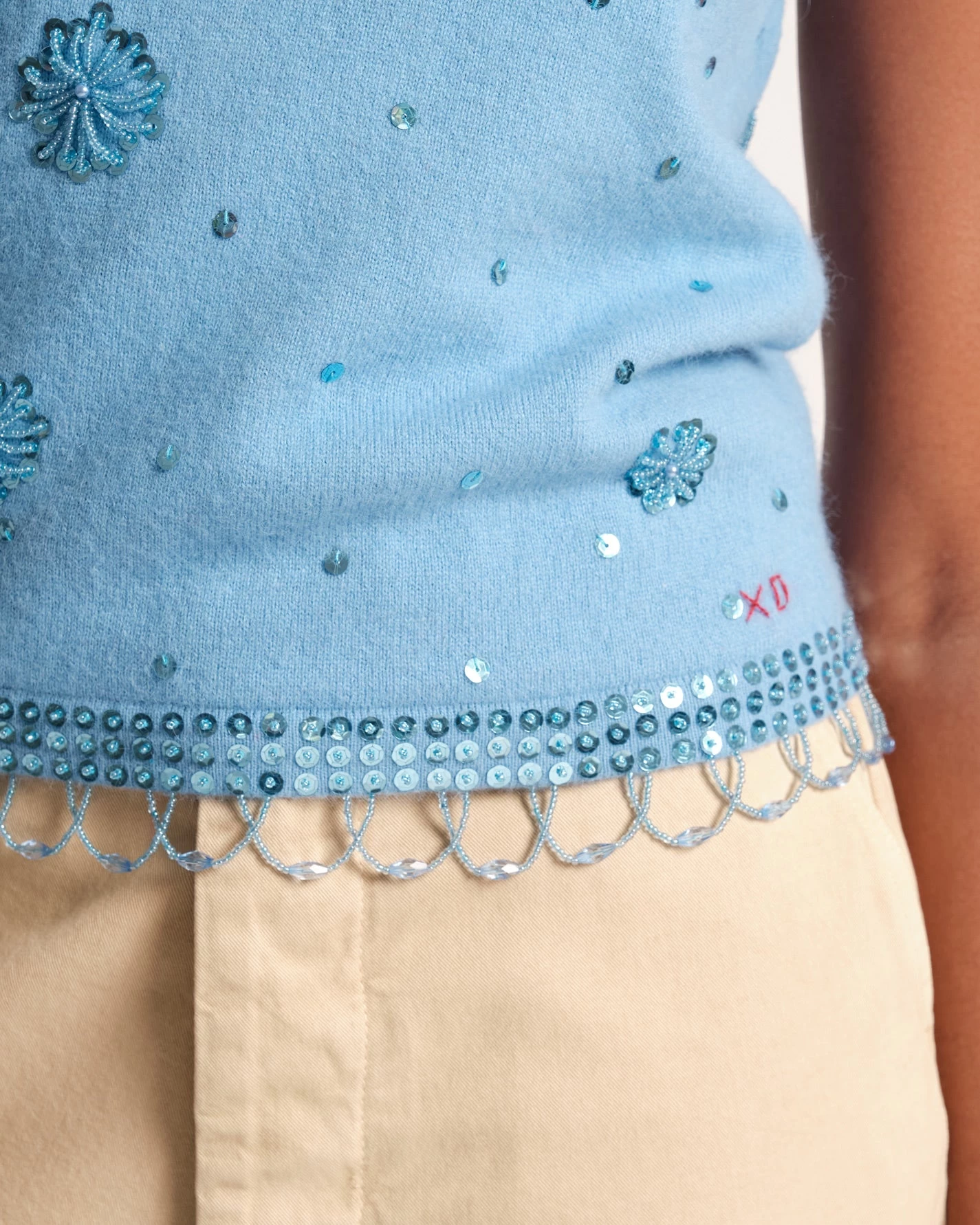 The icing on top of separates, our hand-embroidered Knit Shell Top is a women’s sleeveless top with a rounded collar, decorative waistline, beaded bodice designs, and sequined hems. Worn on its own, layered over sleeves, or under a sweater – this dressy shell top is a showstopper.