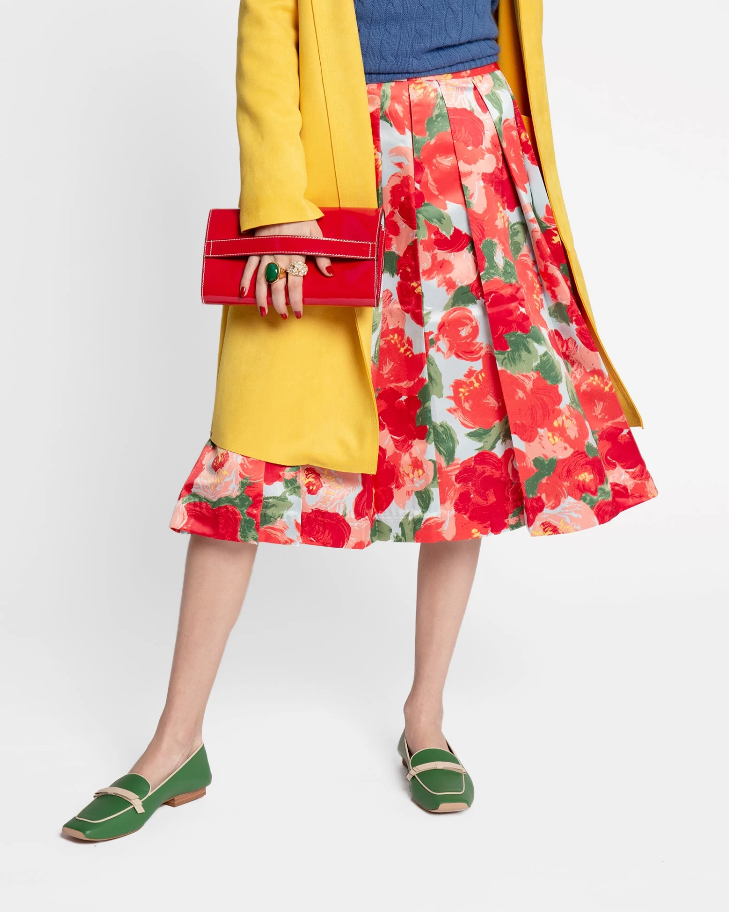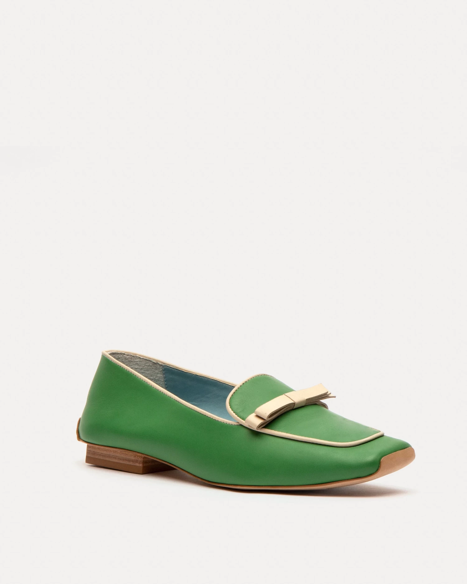 Soft calf leather with contrast leather bow. Leather sole. Square stacked heel.