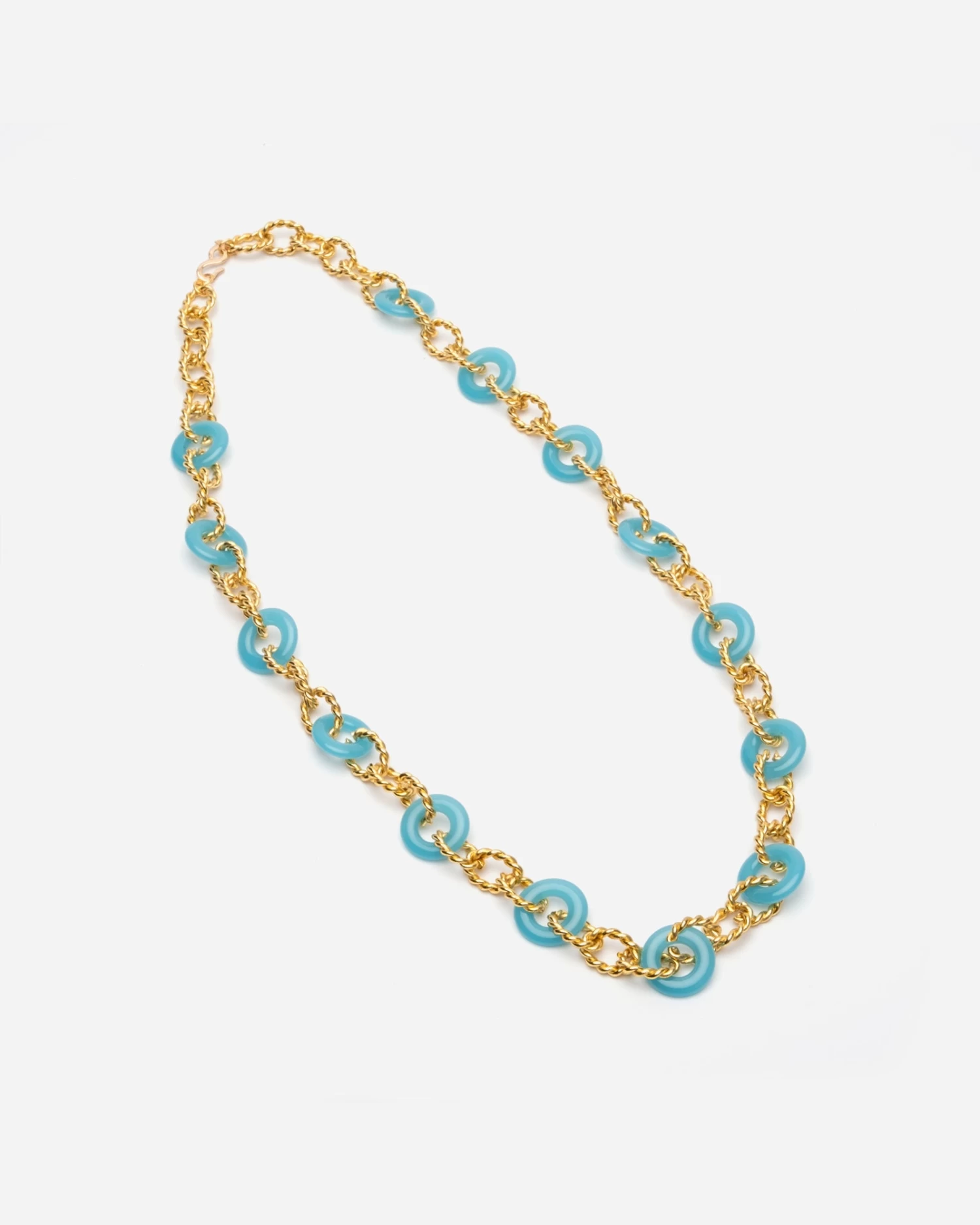 We love layering necklaces at Frances Valentine and we love the mix of the bright teals with brushed gold links. Worn on its own or layered with one of our gold link necklaces the Teal Gold Disc Necklace is easy to style with nearly everything.Â