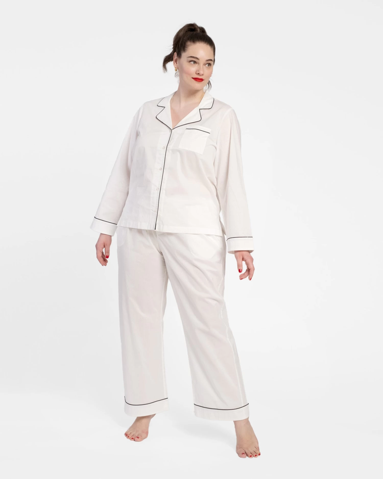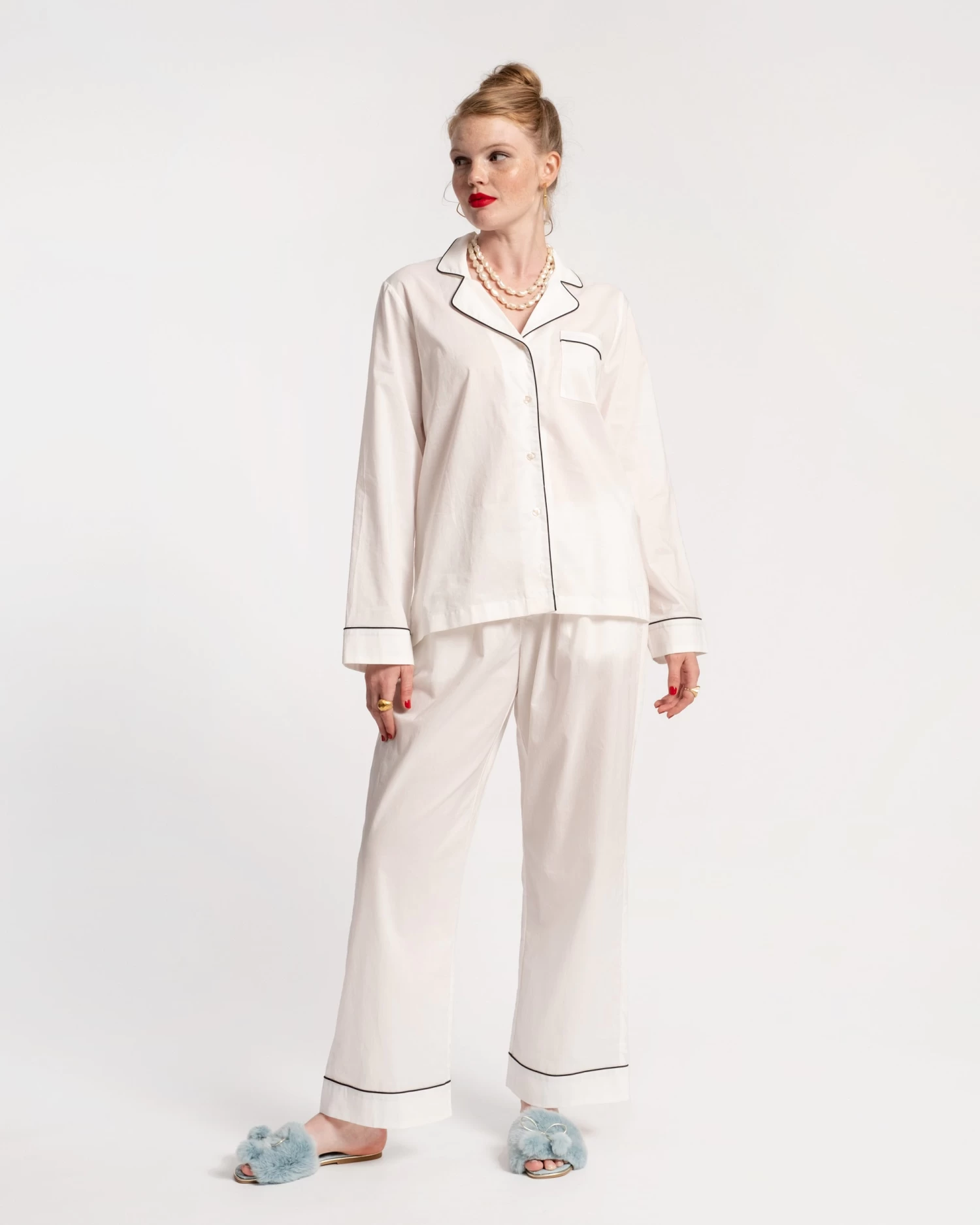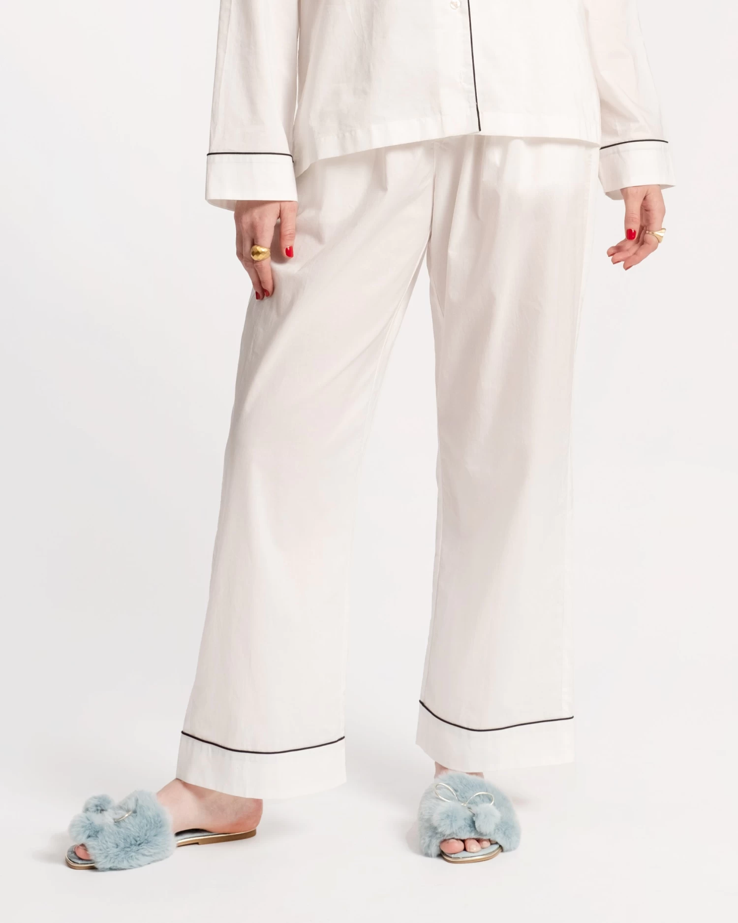 Dress up while you dress down! Our new lightweight poplin Teddy Pajama Pants are both comfortable and chic. These classic style pants are complete with a drawstring waistband and contrast piping detail. These will quickly become your go pajamas!