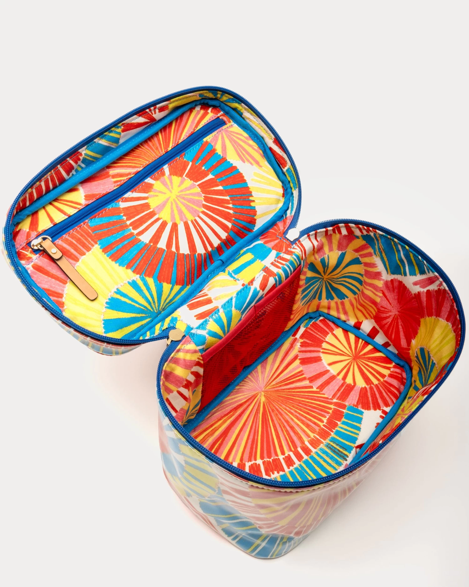 Our Train Case Cosmetic in custom FV Starburst print is the perfect size for travel and or every day use! With an interior zippered pocket and elastic side storage, this cosmetic will be your new go to travel accessory.