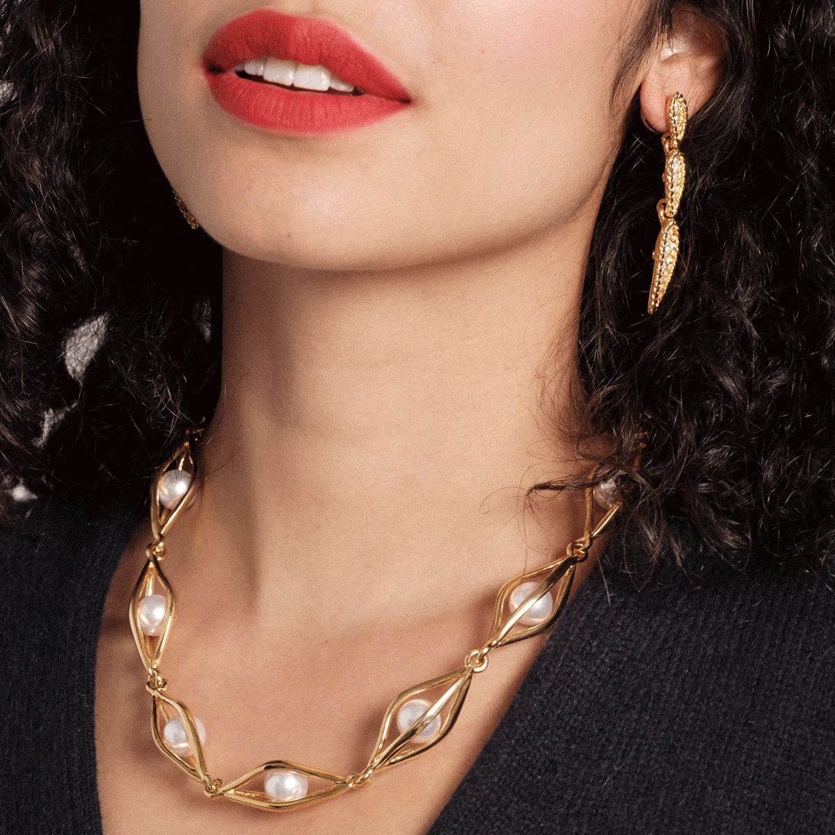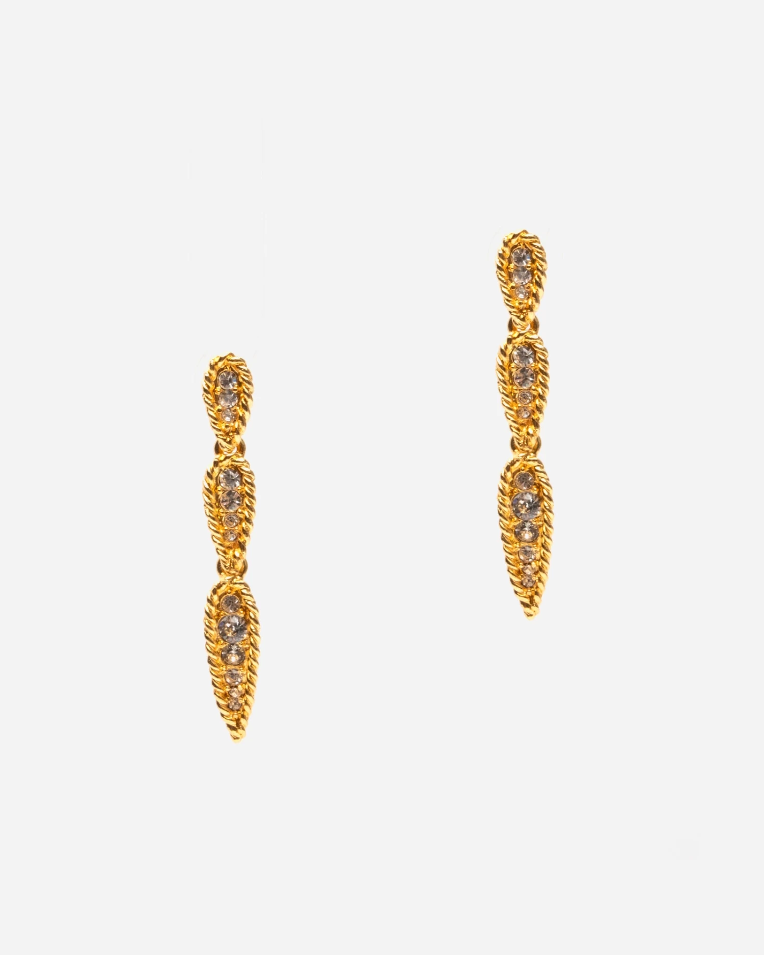 Tri Gold Crystal Tear Drop Earrings, three satin gold with petal shaped crystal tears.