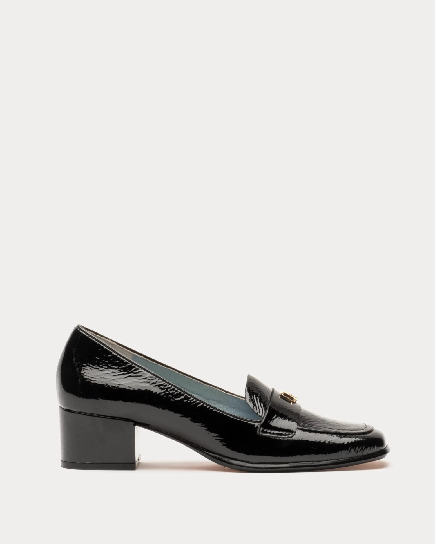 An instant classic, our Twiggy Loafer Heel is a colorful leather shoe with a square toe, covered block heel, and gold FV logo-buckle detail. Updated with softer crinkled leather, Twiggy is a comfortable walking heel with endless style.