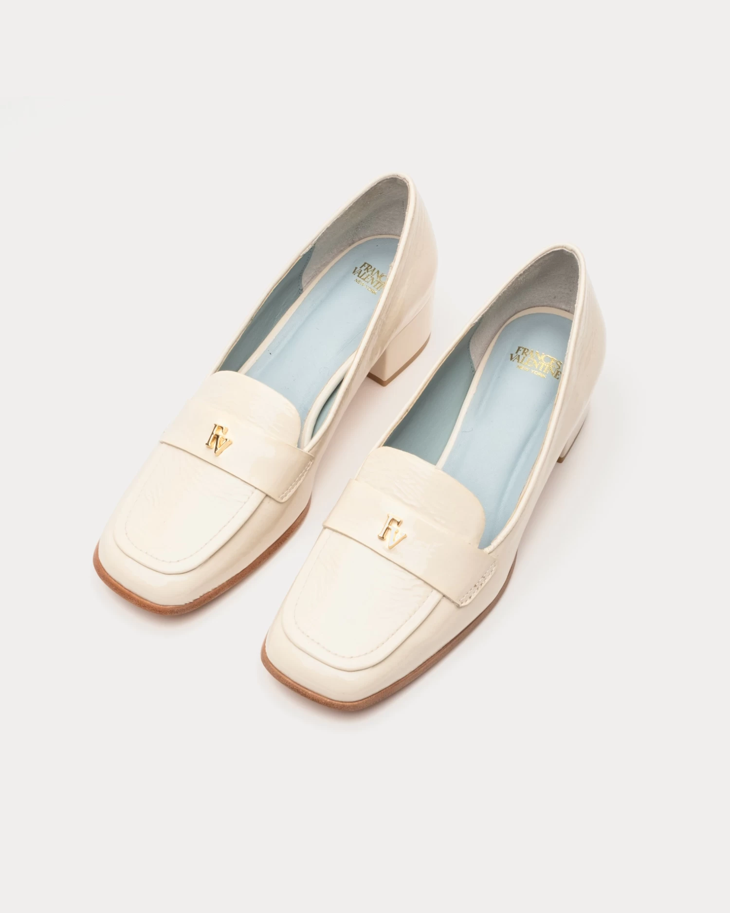 An instant classic, our Twiggy Loafer Heel is a colorful leather shoe with a square toe, covered block heel, and gold FV logo-buckle detail. Updated with softer crinkled leather, Twiggy is a comfortable walking heel with endless style.