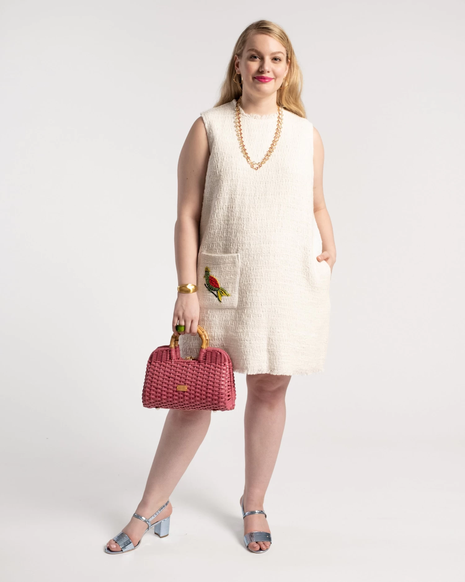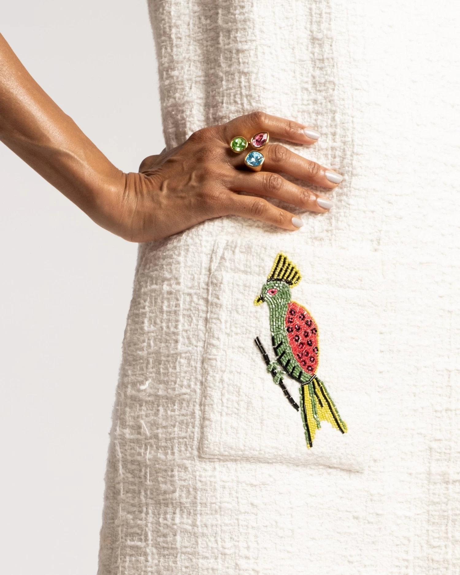 Our Twiggy Fringe Dress is screaming for a cocktail. This just above the knee silhouette features a brightly hand beaded embroidered bird on the front pocket. We love this fun and colorful detail! Pair with any of our heels and some jewelry for a perfect look.