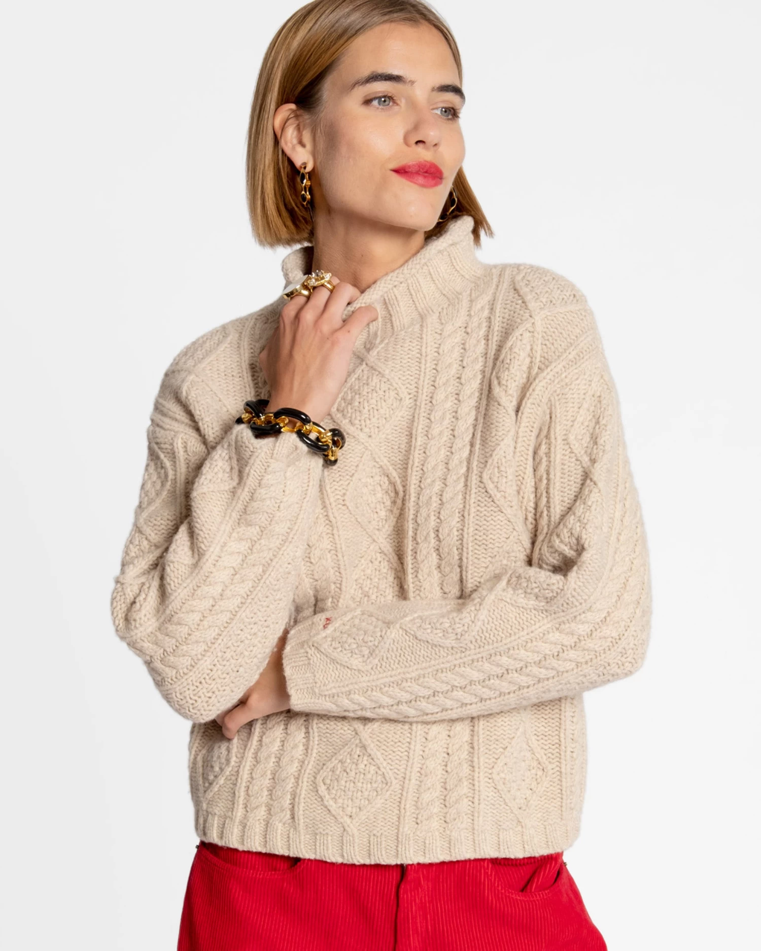 Introducing the Wool Fisherman Skipper Pullover, a classic “Aran” style cable pullover with roll edge collar and drop sleeves. This effortless classic can be worn anywhere and easily styled with your favorite pieces.Â